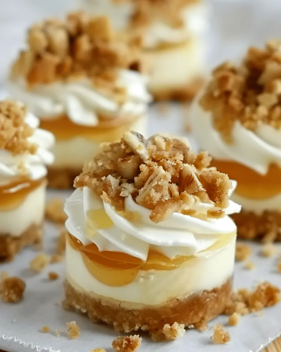 Delight in the sweet and crunchy flavors of Apple Crisp Mini Cheesecakes, a perfect dessert for any occasion.