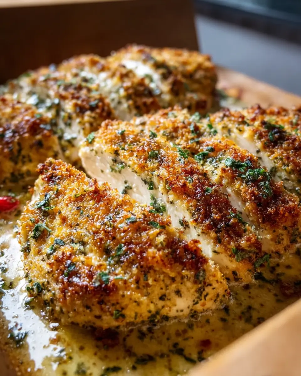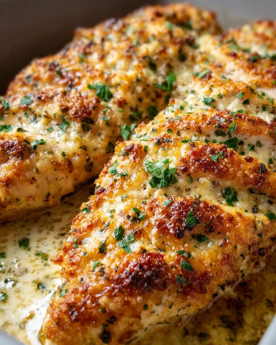 A delicious baked chicken dish with a crispy golden Parmesan mozzarella crust, perfect for a weeknight dinner.