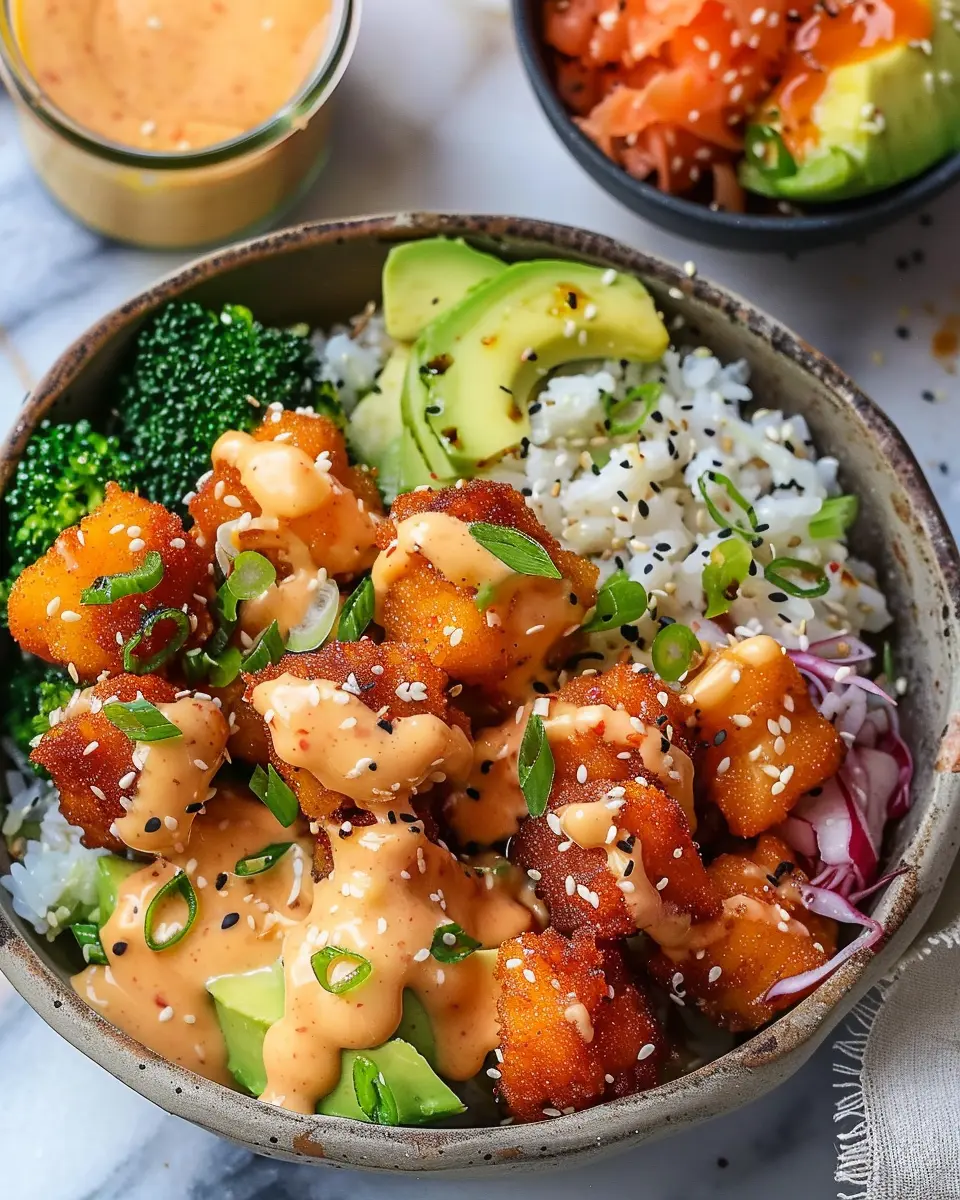 Bang Bang Salmon Bites Bowls are a delicious and simple meal that combines crispy salmon with a spicy sauce, making it a favorite for any occasion.