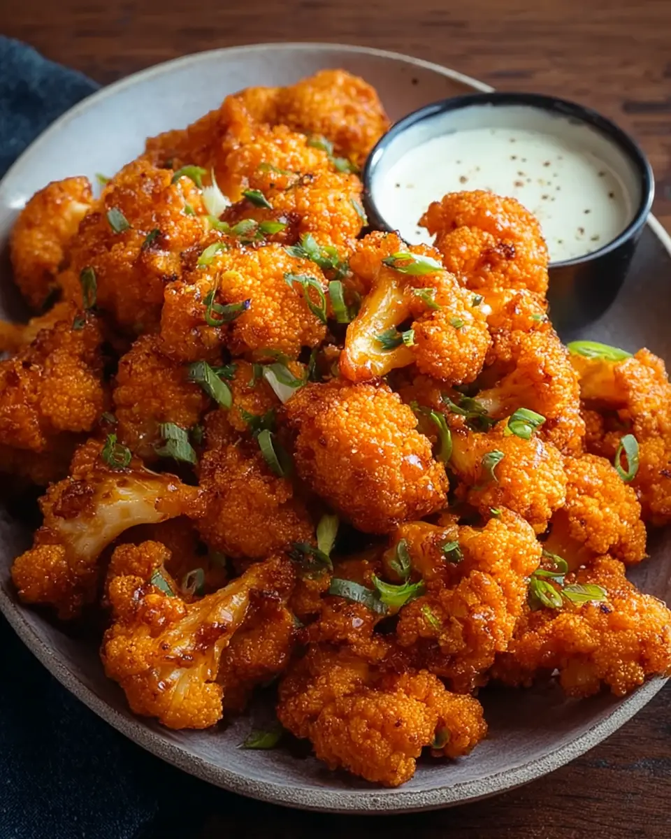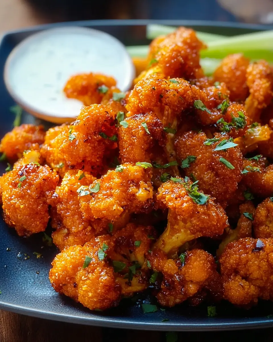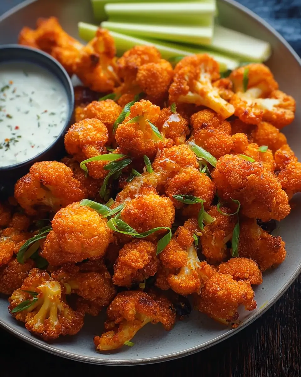 A spicy and easy-to-make snack featuring crispy buffalo cauliflower wings that are perfect for any gathering.