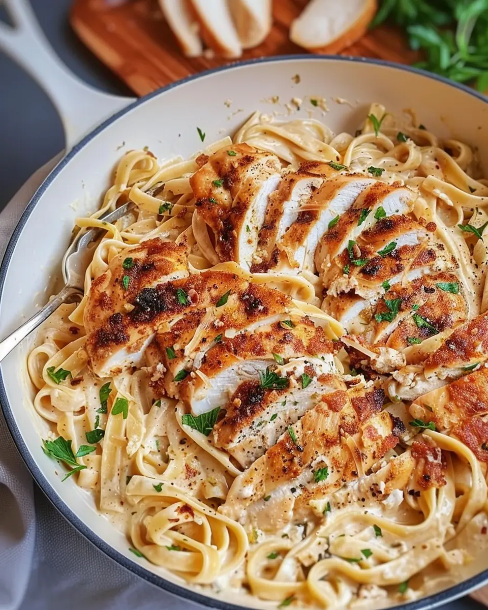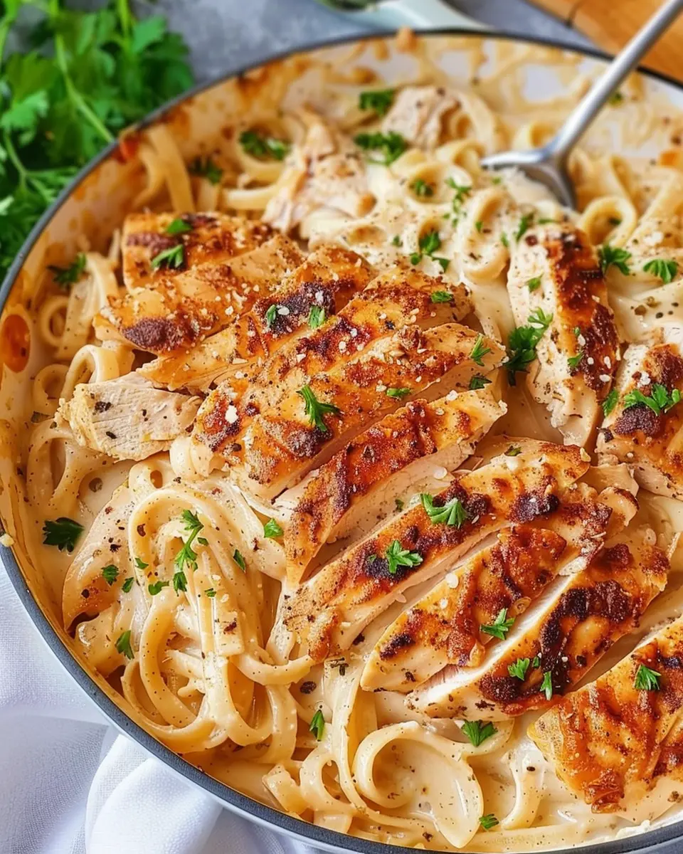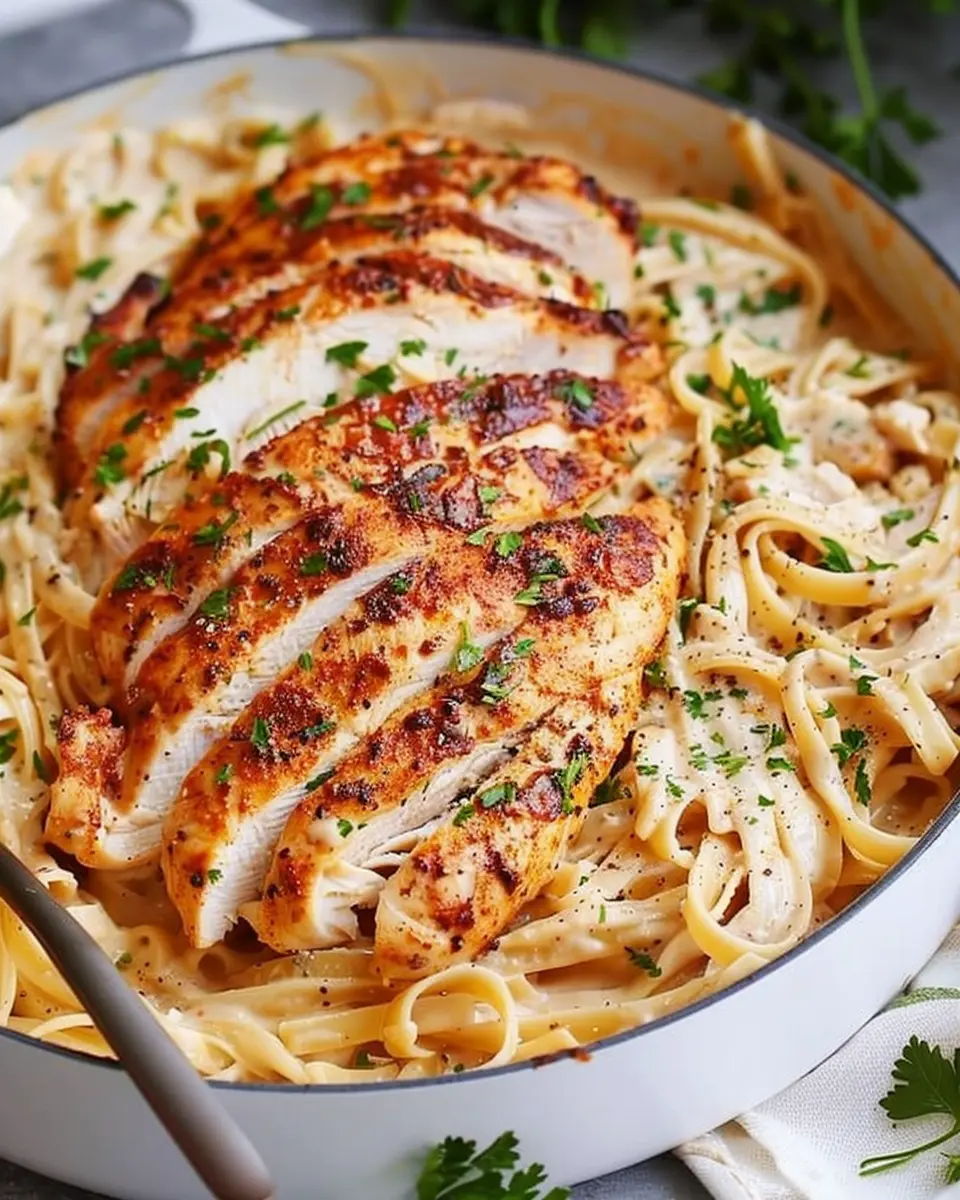 Combine Chicken and Pasta: In your large skillet, add the cooked pasta and sliced Cajun chicken to your creamy sauce. Make sure to toss everything together, so each noodle is perfectly coated with that rich sauce.