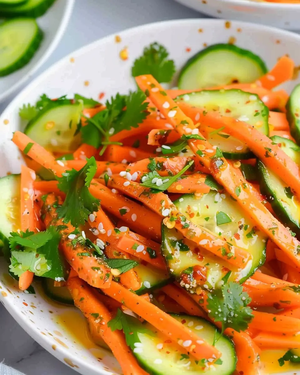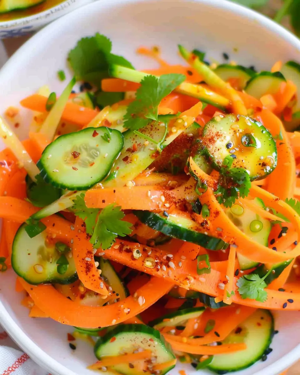 A refreshing and spicy salad featuring crunchy carrots and cucumbers.