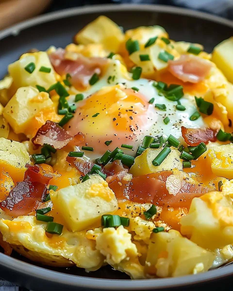 Keywords: Cheesy Potato Egg Scramble, Comfort Food, Turkey Bacon