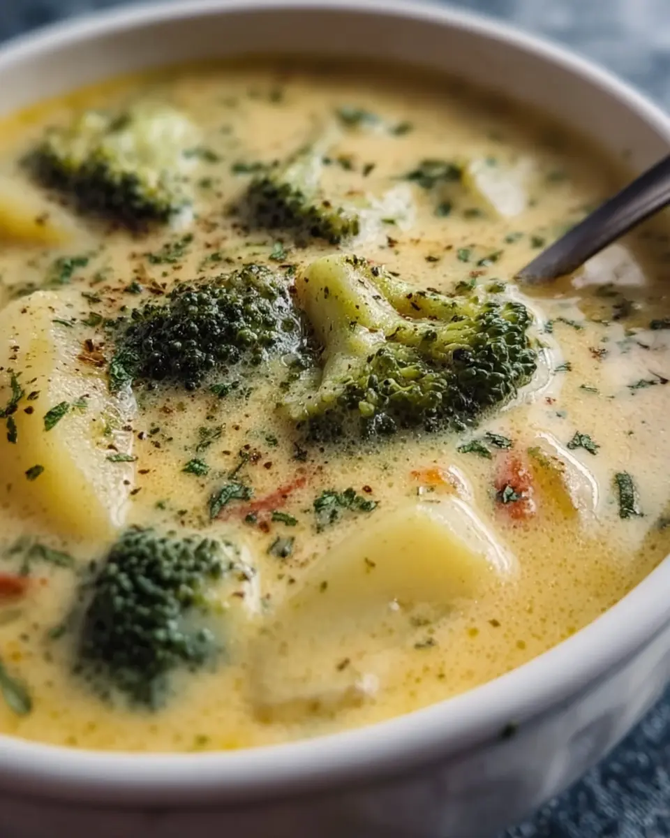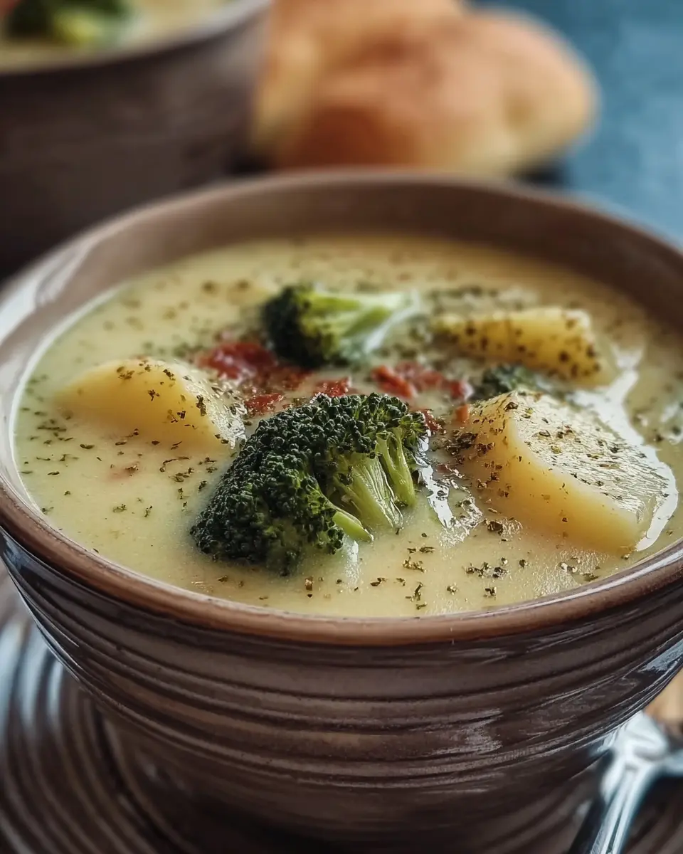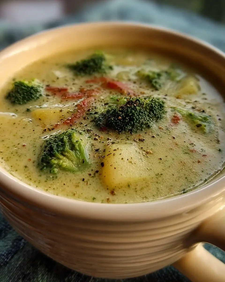 A warm and comforting soup perfect for chilly days, featuring creamy potatoes and fresh broccoli, enhanced with crispy turkey bacon.