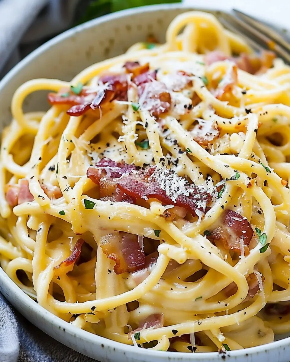 Keywords: Creamy Bacon Carbonara Pasta, Turkey Bacon, Pasta Recipe, Restaurant-Quality, Indulgent