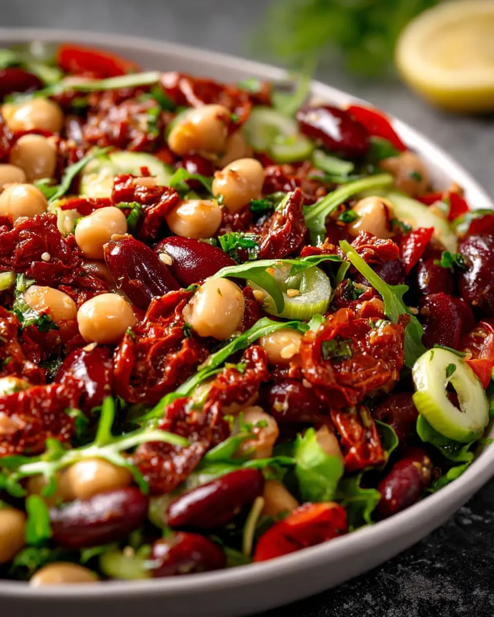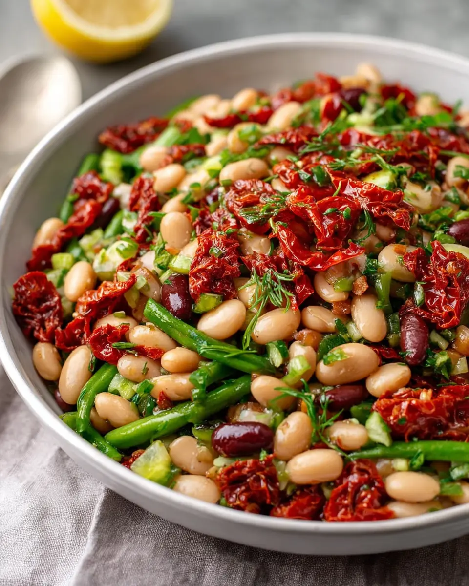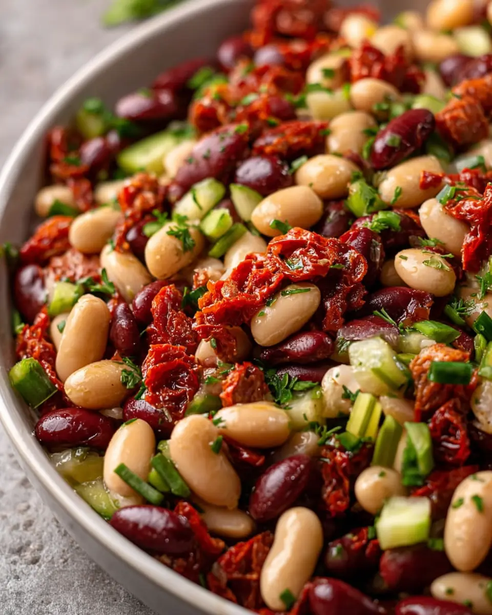 A flavorful and nutritious bean salad featuring the savory taste of sun-dried tomatoes.