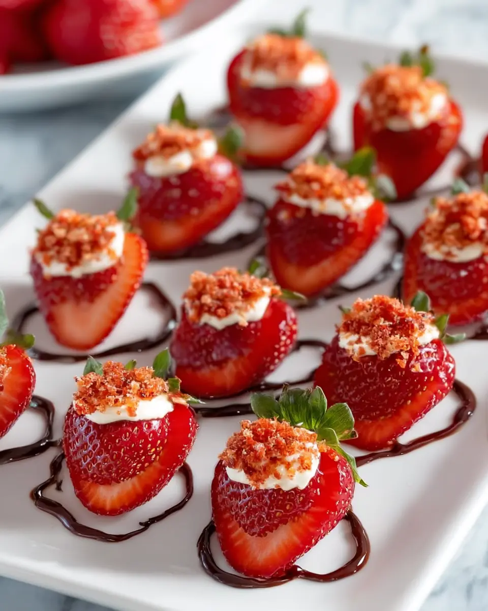 Arrange them on the serving platter in a fun design, perhaps in a circle or a line. These deviled strawberries not only taste amazing but also look stunning—a great way to impress your friends at any gathering!
