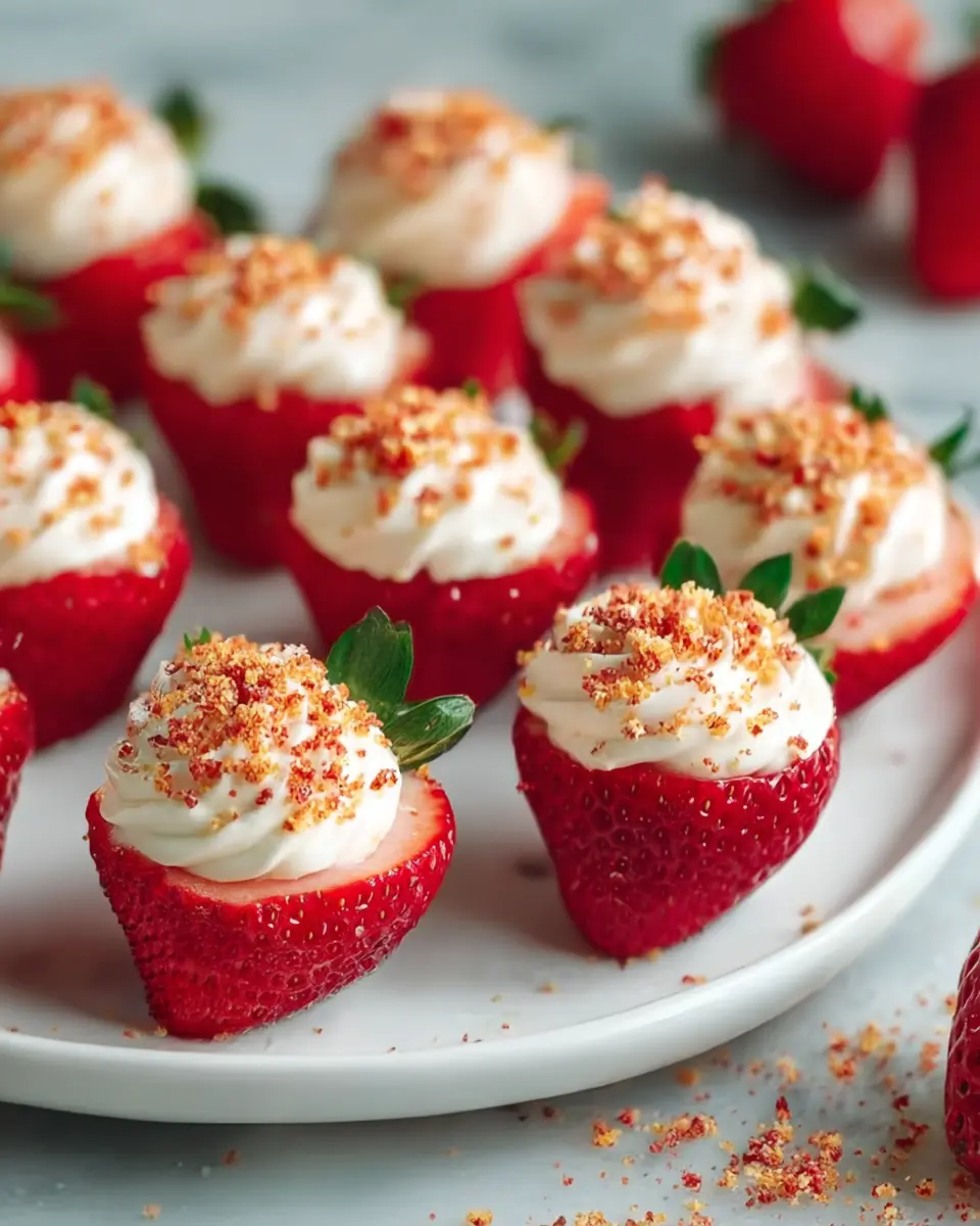 With all the components ready, it’s time to assemble your deviled strawberries! Start by using a piping bag or a simple plastic zip bag with the corner snipped off to fill each hollowed strawberry with that delicious cream cheese filling. Once filled, sprinkle the strawberry crunch topping generously on top of each filled strawberry.