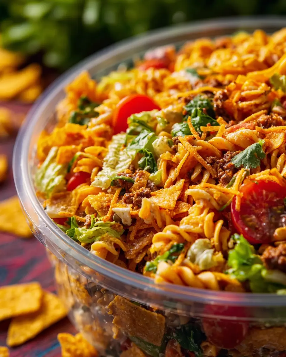 A delicious twist on taco night with the crunch of Doritos and the heartiness of pasta salad.