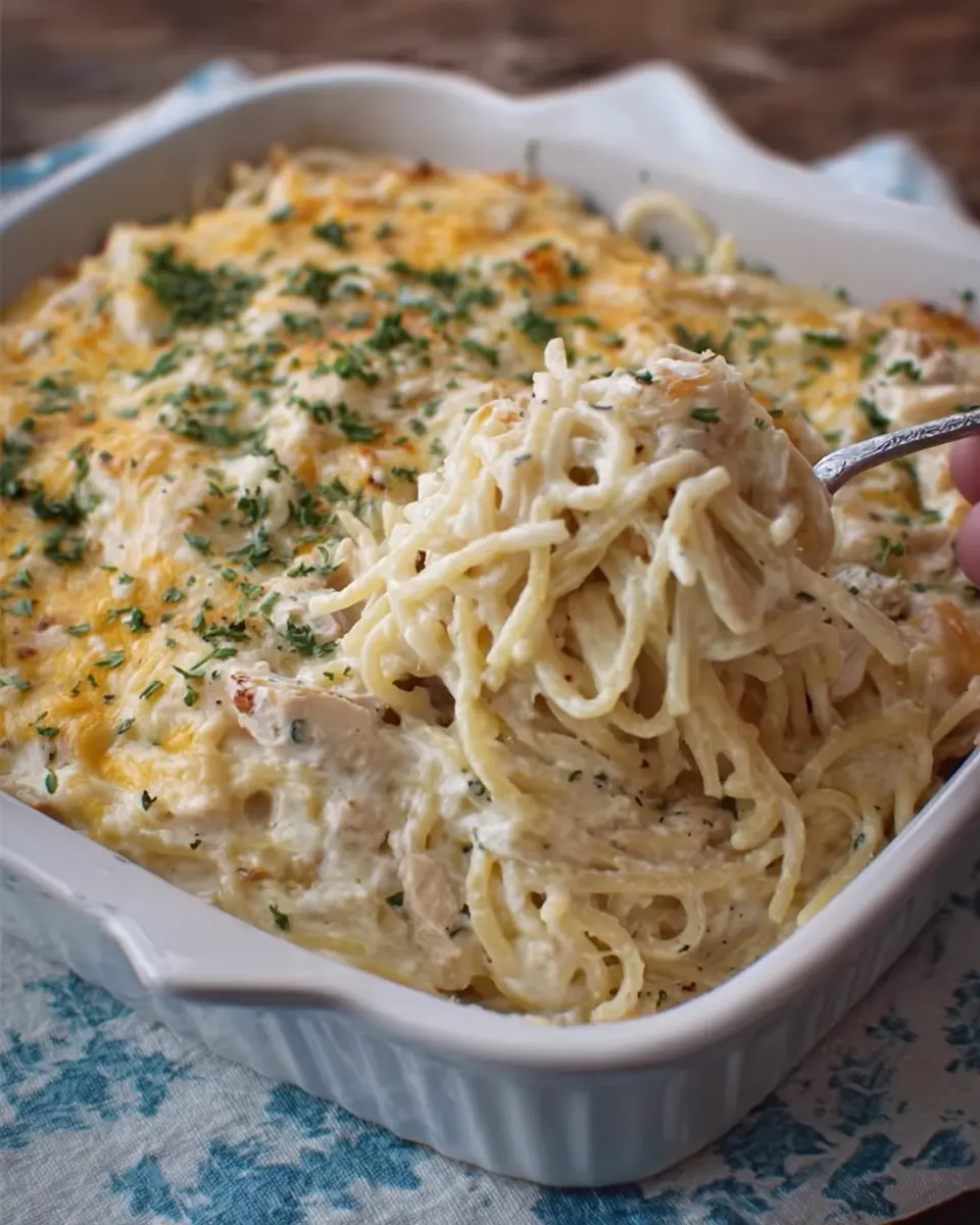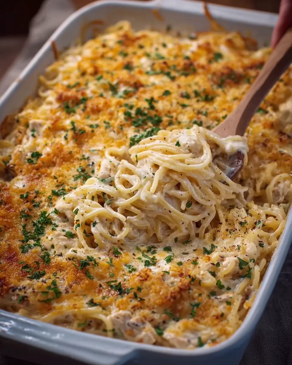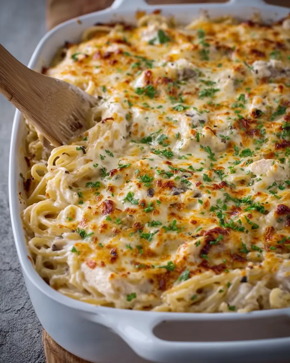 Now it’s time to bring everything together! In a large casserole dish, combine the cooked spaghetti, shredded chicken, and the creamy mixture. Add in 1 cup of sautéed mushrooms and one cup of frozen peas to brighten up the dish with some veggies. Give everything a gentle stir until all the ingredients are well-coated with the creamy goodness. If you like a little crunch, you can top it with some turkey bacon or breadcrumbs for an extra texture boost!