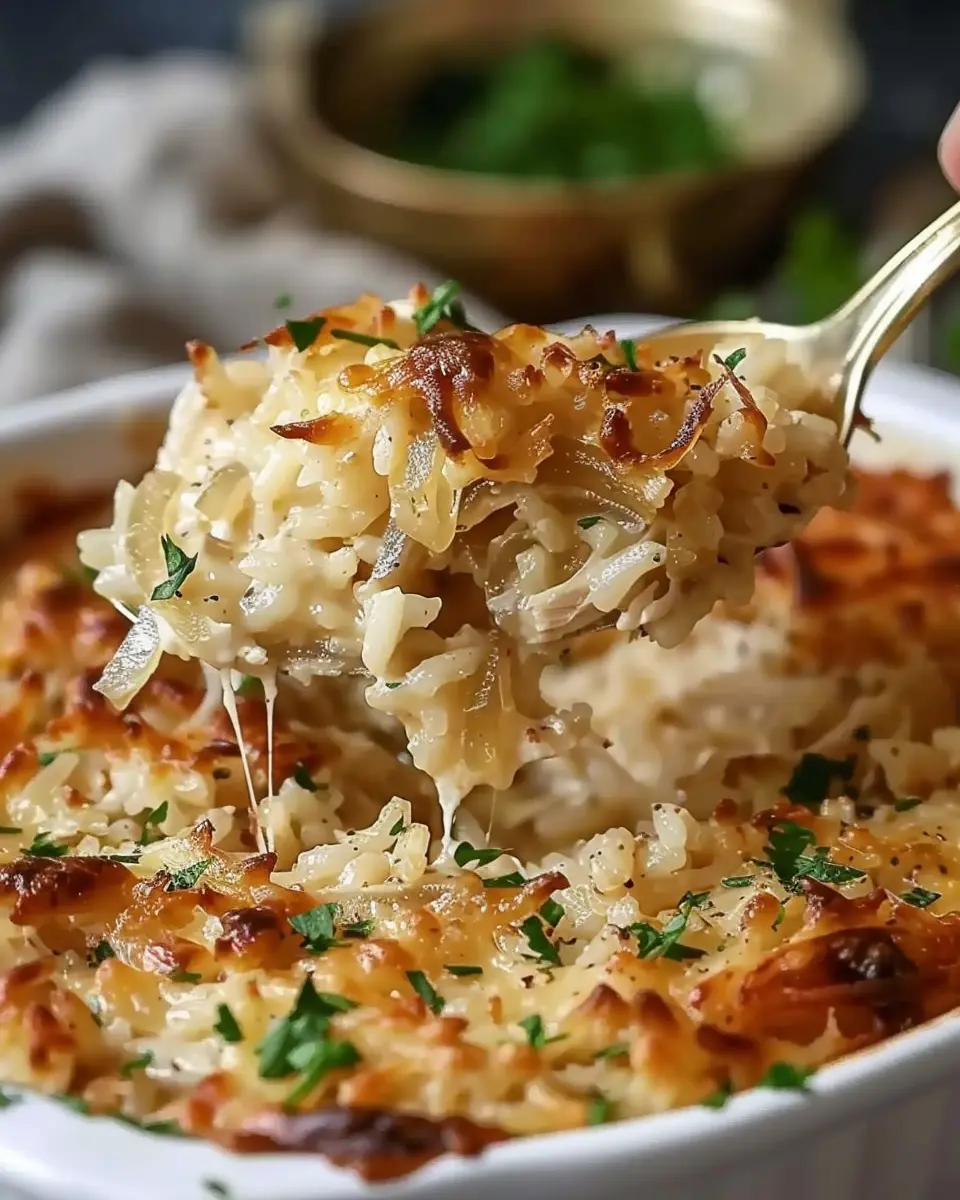 French Onion Chicken Rice Bake is a comforting dish perfect for family gatherings.