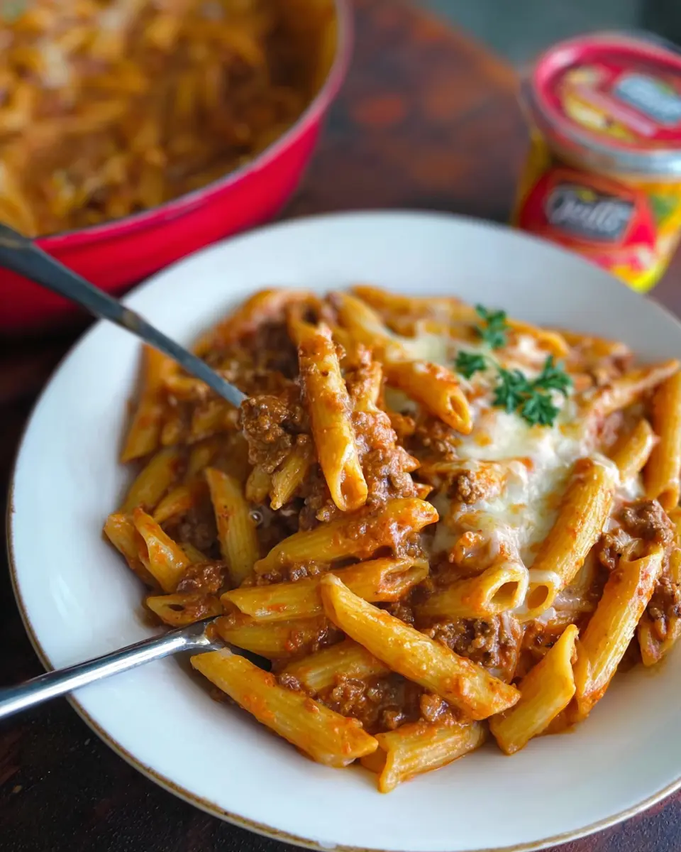 Once you’ve cooked your pasta, drain it and add it directly into your skillet with the beef and sauce mixture. Gently toss everything together until each piece of pasta is coated in that rich, flavorful sauce.