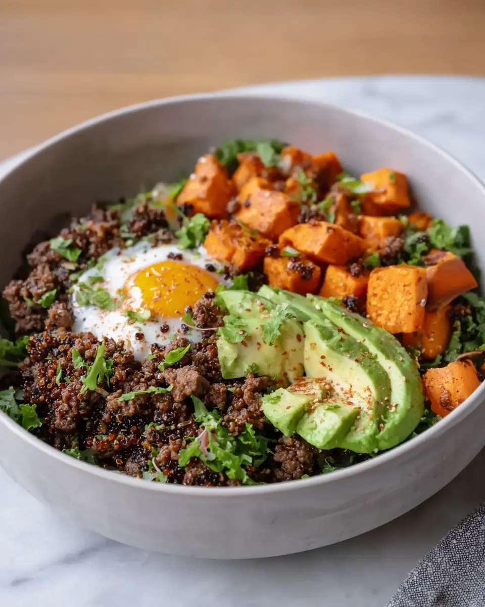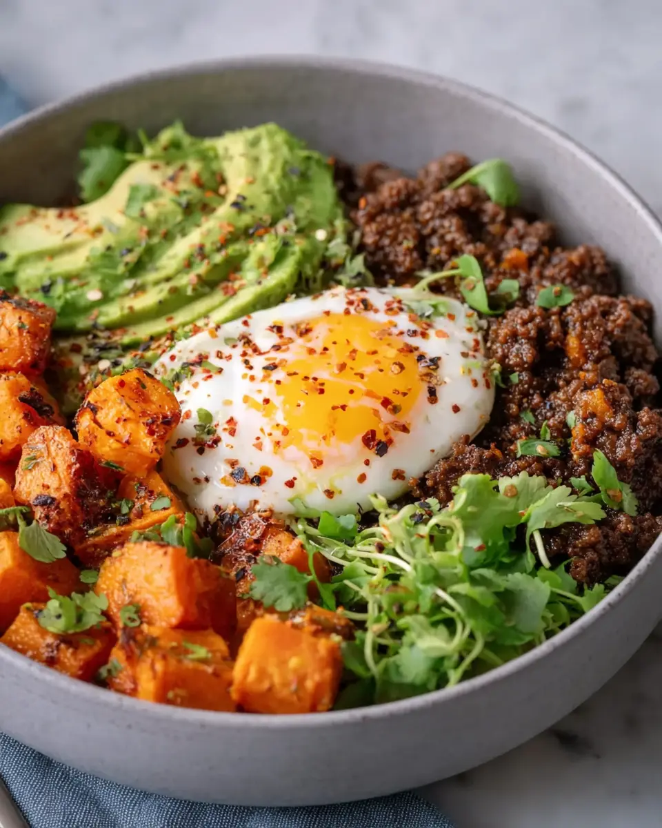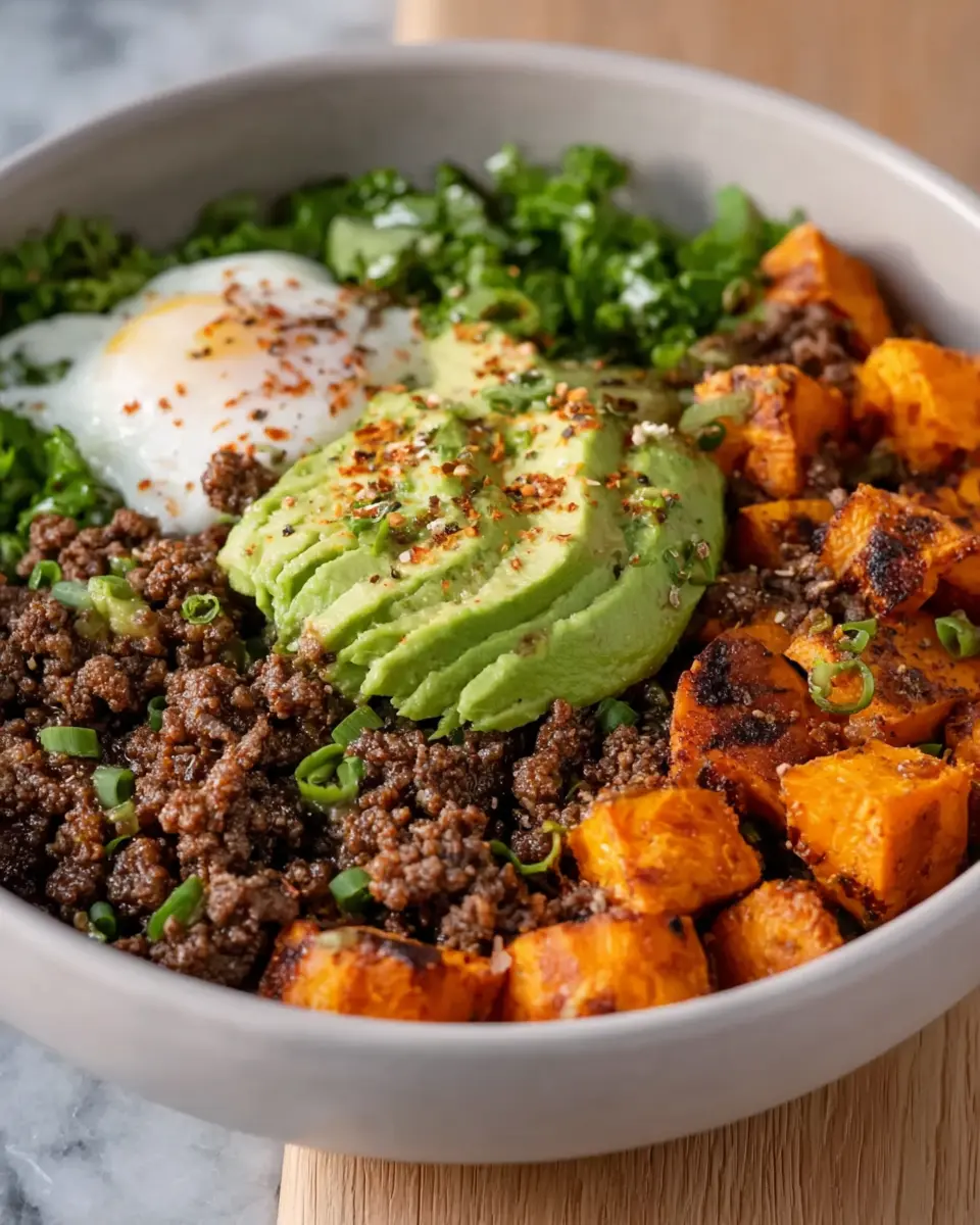 Nutritious Ingredients: Packed with lean ground beef, sweet potatoes, and creamy avocado, this bowl provides a balanced mix of protein, healthy fats, and complex carbohydrates. According to the USDA, sweet potatoes are high in vitamins A and C, making them a fantastic addition for those looking to boost their immune system while keeping energy levels high.