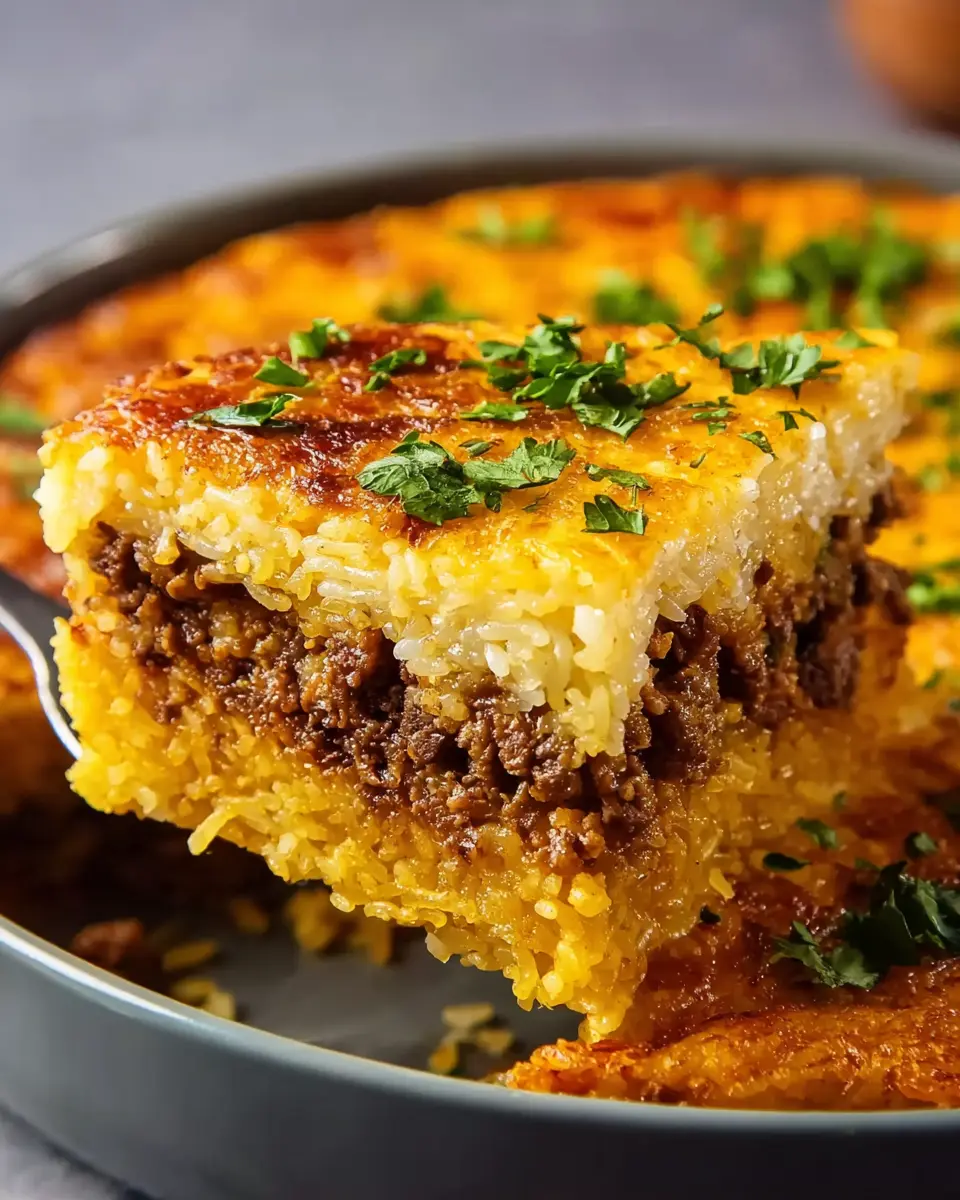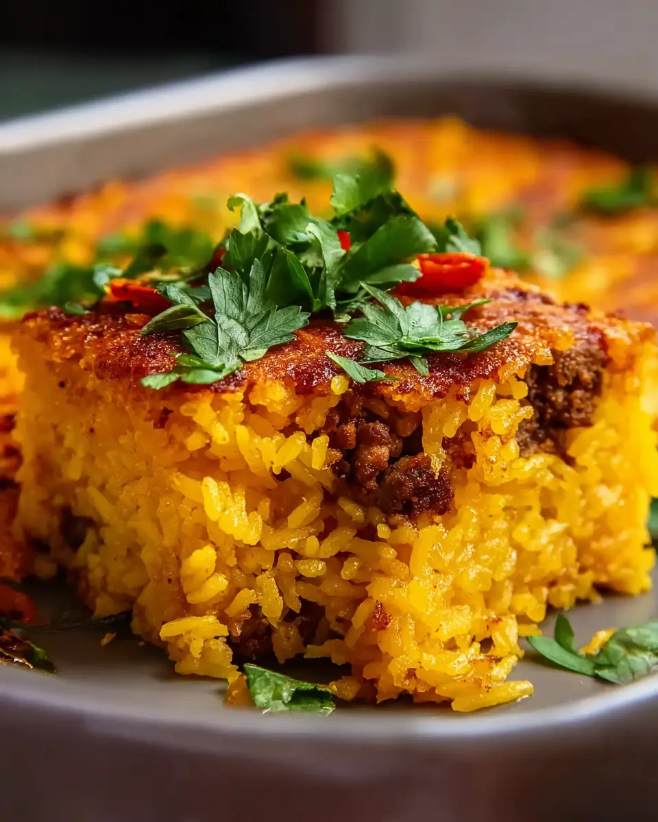 Keywords: Layered Golden Rice Bake, Spiced Meat, Turkey Bacon, Comfort Food