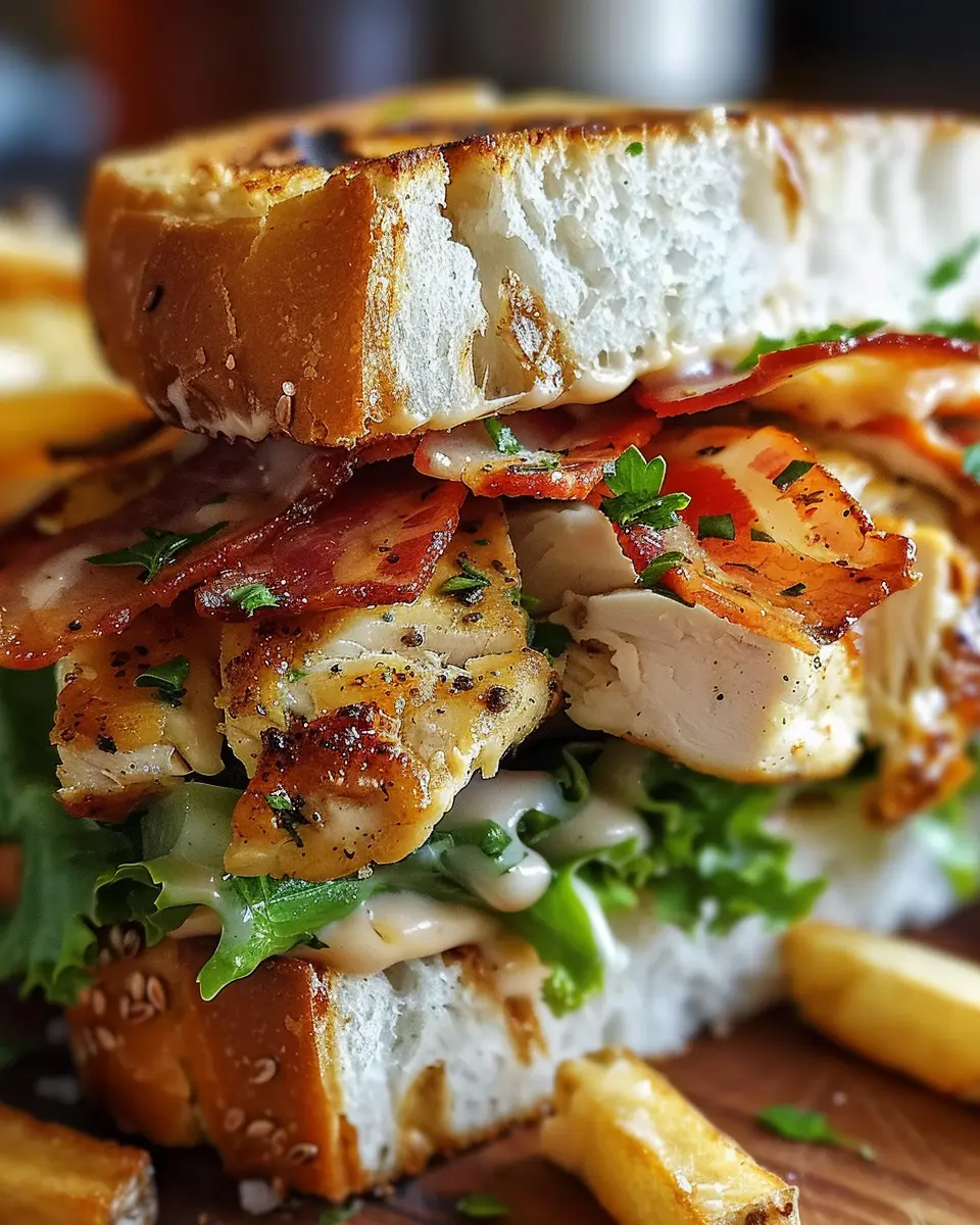 Once assembled, you can cut the sandwich in half or into quarters for a manageable bite. Each element comes together in perfect harmony, creating a loaded chicken club that’s both hearty and delectable. Enjoy your creation with a side of sweet potato fries or a simple green salad for a complete meal. Bon Appétit!