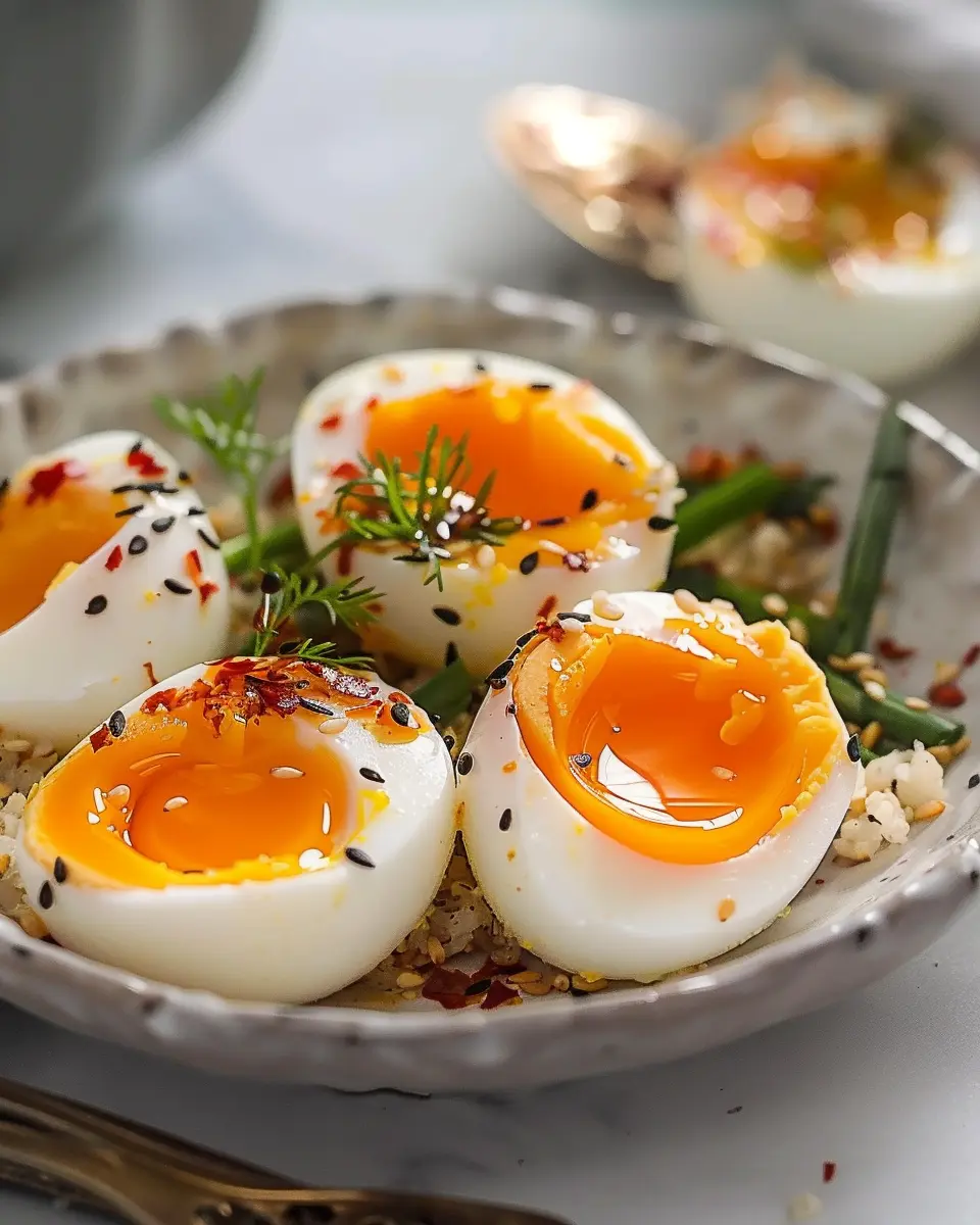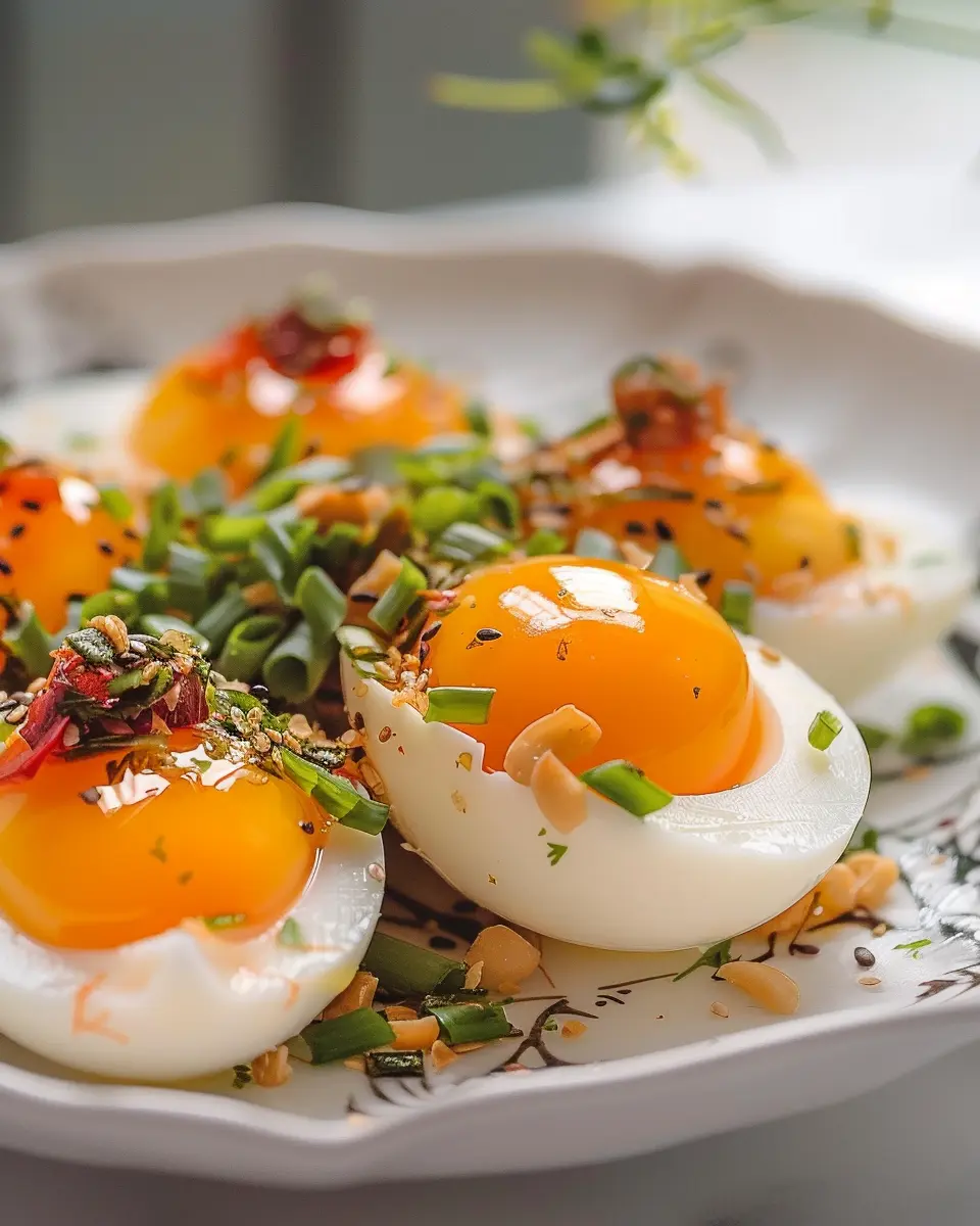 - Plating: Remove the eggs from the marinade and cut them in half. You can garnish them with sesame seeds or chopped green onions for a beautiful presentation.