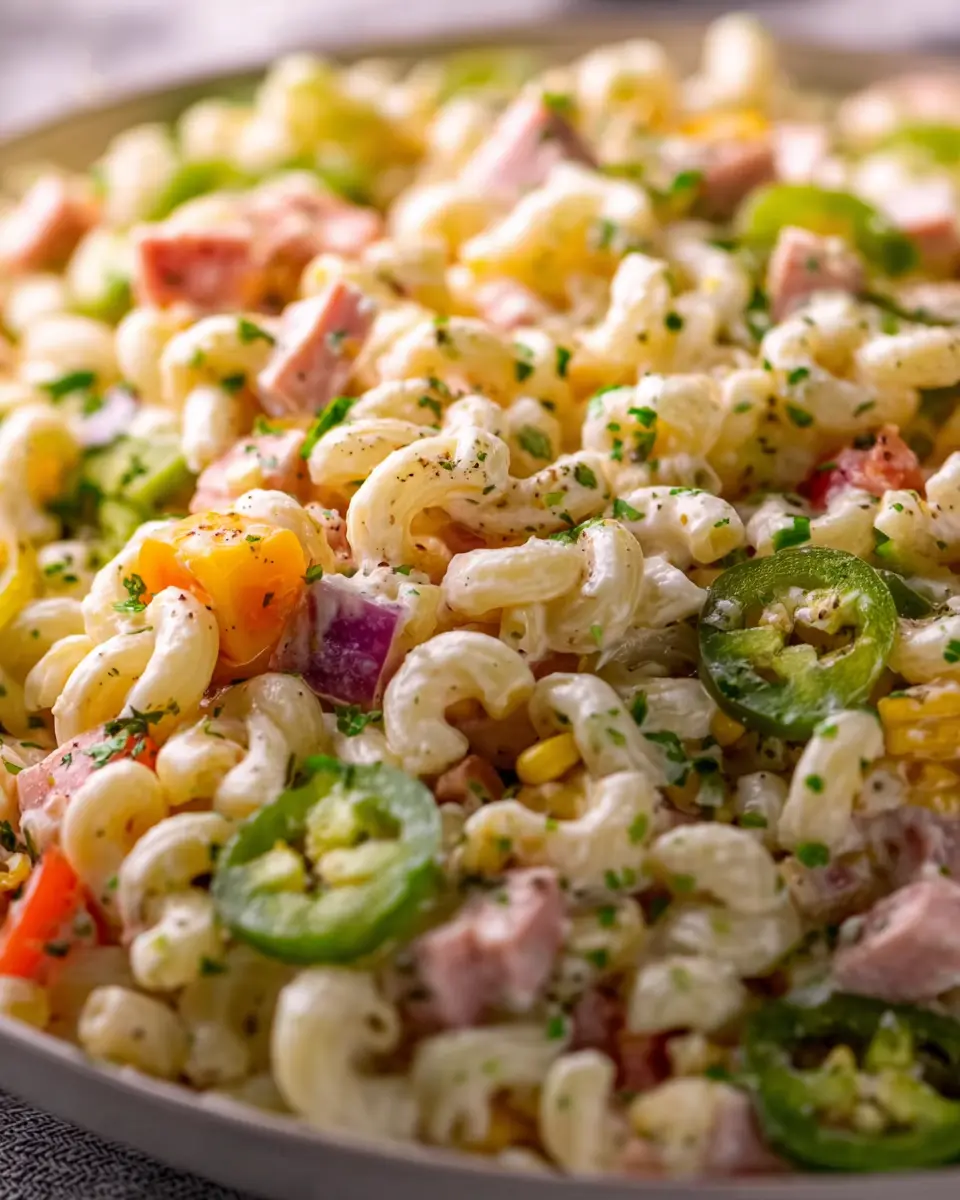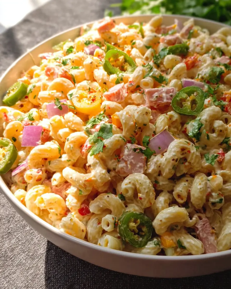 A delicious Mexican macaroni salad featuring turkey bacon and chicken ham, perfect for any occasion.