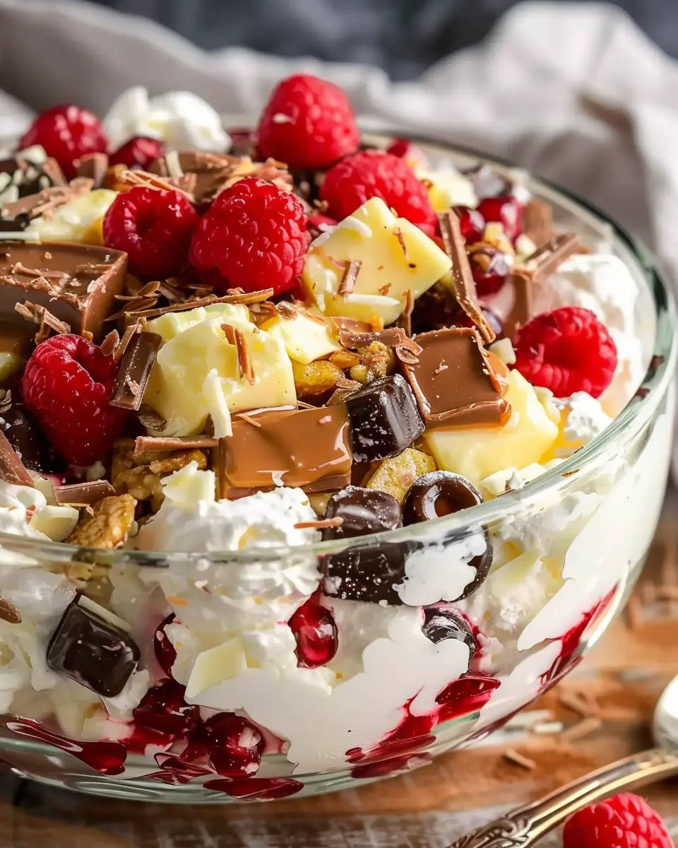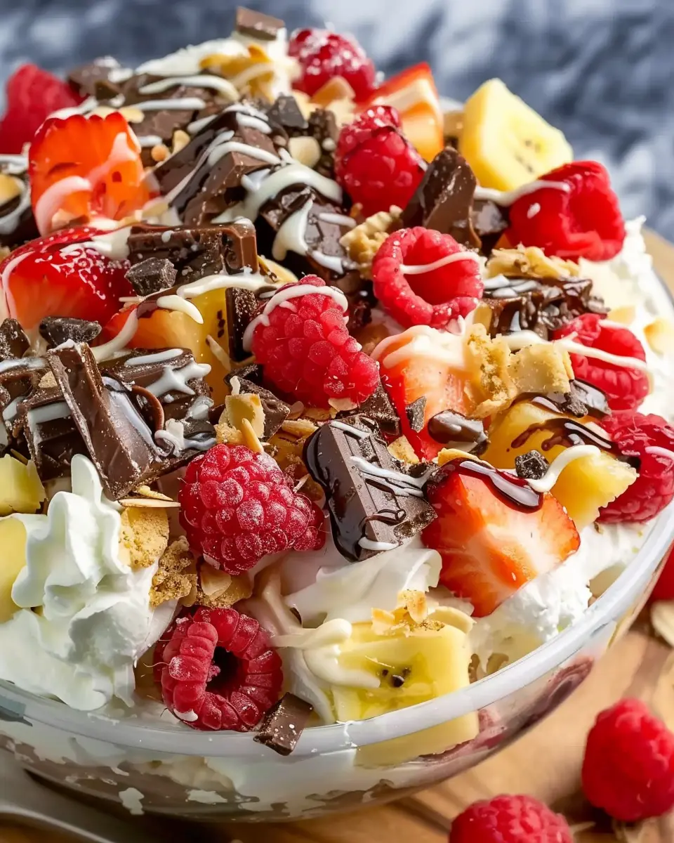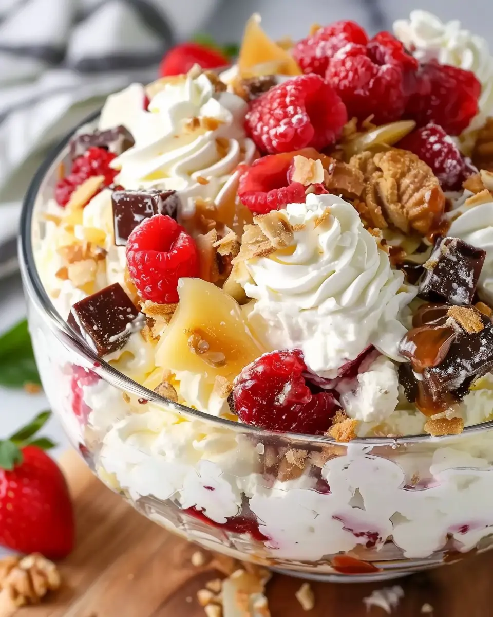 A delightful and indulgent dessert salad that combines the creamy flavors of cheesecake with the freshness of fruits and crunchy components.
