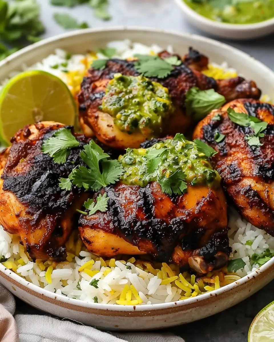 Now that everything is cooked, it’s time to assemble your delicious Peruvian Chicken and Rice. On each plate, serve a generous scoop of yellow rice topped with sliced grilled chicken. Drizzle the green sauce over the chicken and add a sprinkle of fresh cilantro for garnish.