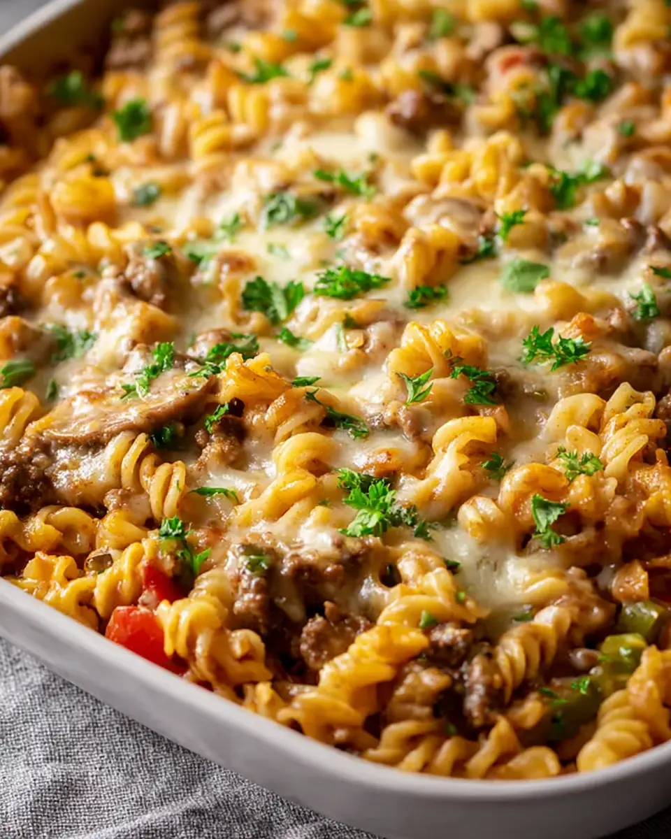 Keywords: Philly Cheesesteak, Pasta Casserole, Comfort Food