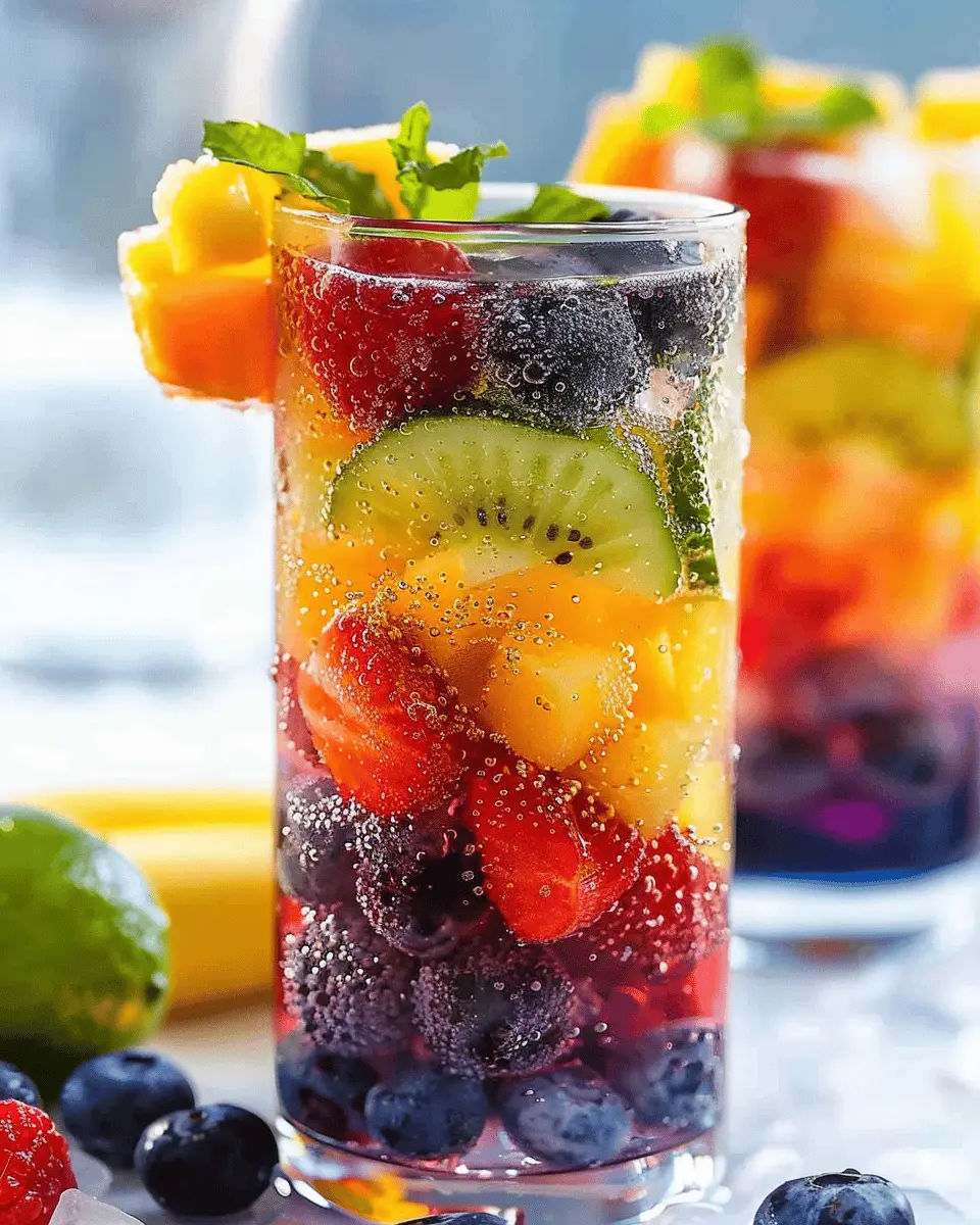 Your rainbow fruit spritzer mocktail is now ready to be served! Pour it into glasses, add a straw if you like, and garnish with a sprig of fresh mint or basil for that touch of elegance. Trust me, your friends will be impressed by the delightful combination of flavors and the stunning presentation.