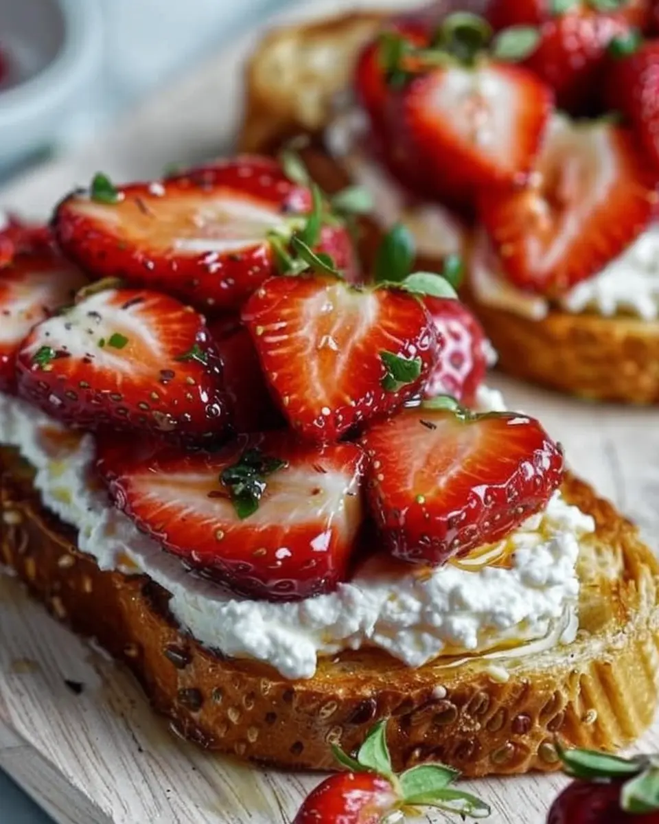 - Spread the whipped ricotta on each slice of toast, top with roasted strawberries, and drizzle with more honey if desired.
