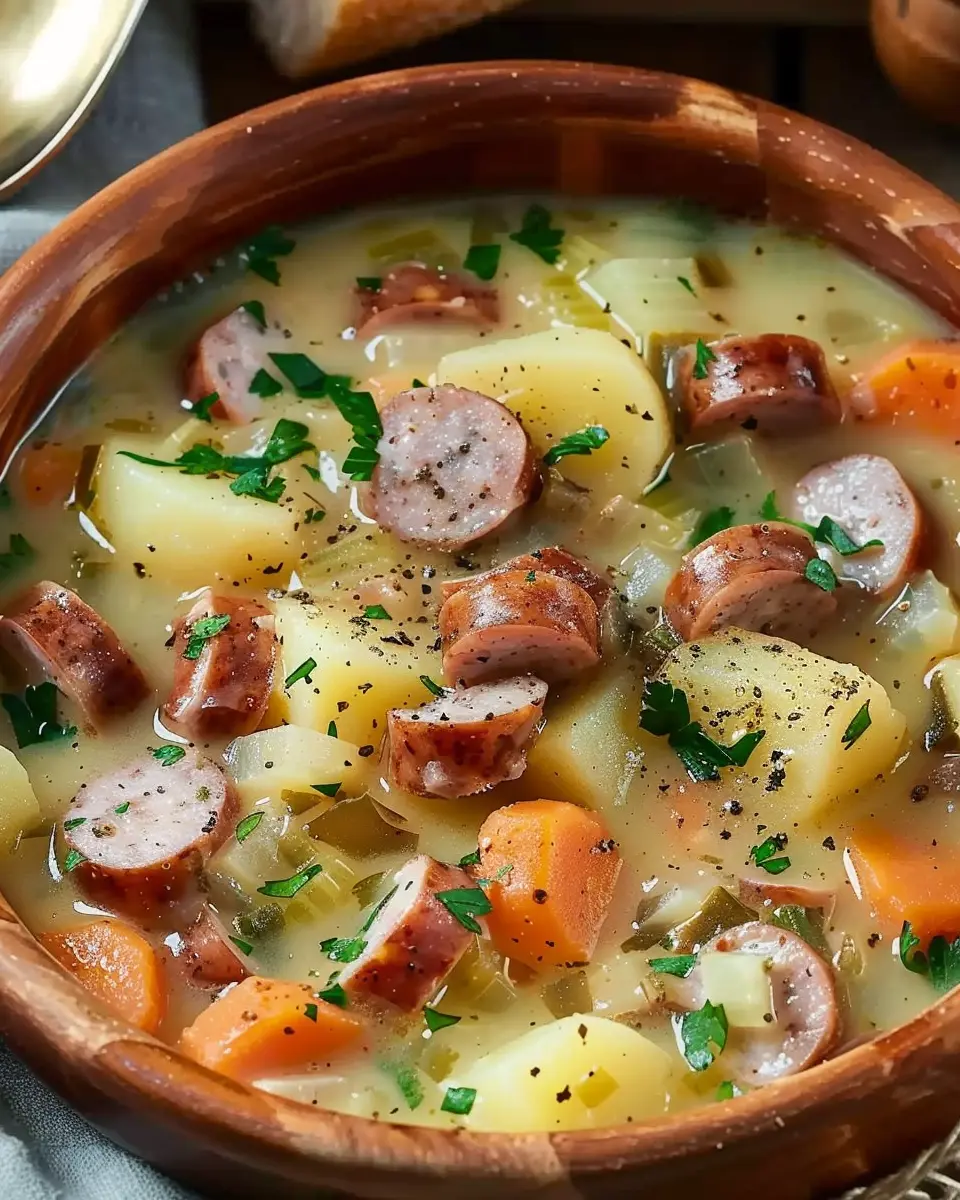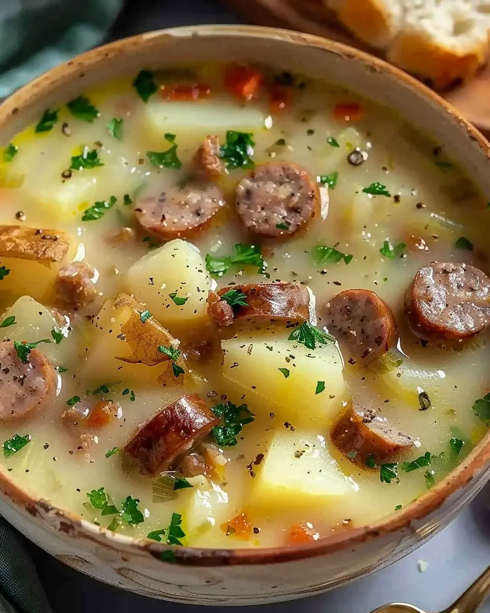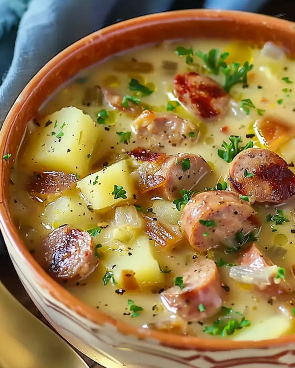 A comforting and hearty German potato soup with sausage, perfect for family gatherings.