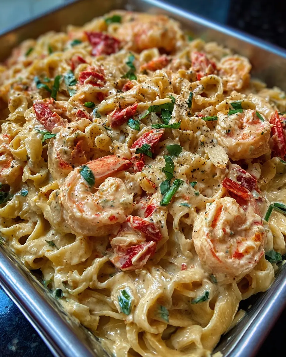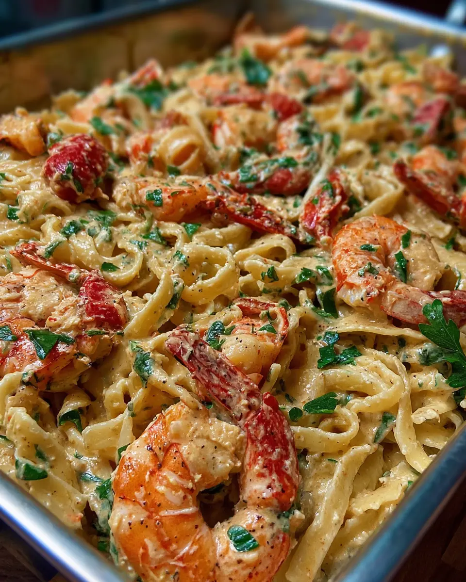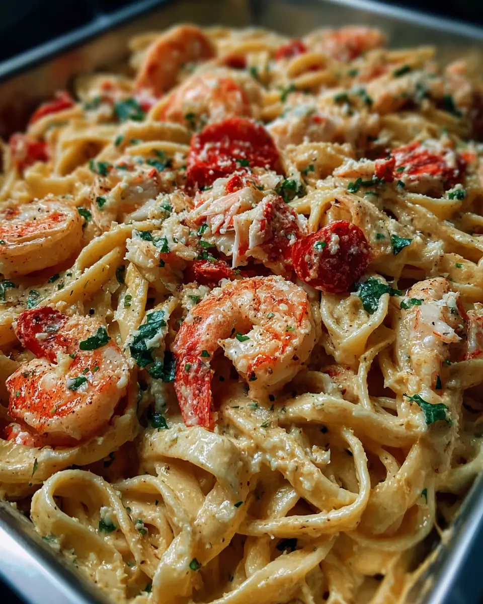 A delightful seafood pasta dish featuring crawfish, shrimp, and crab, perfect for cozy meals.