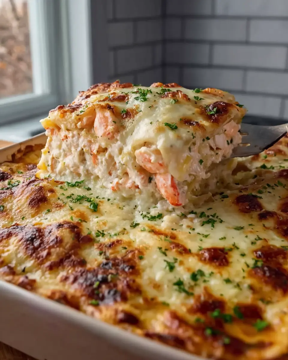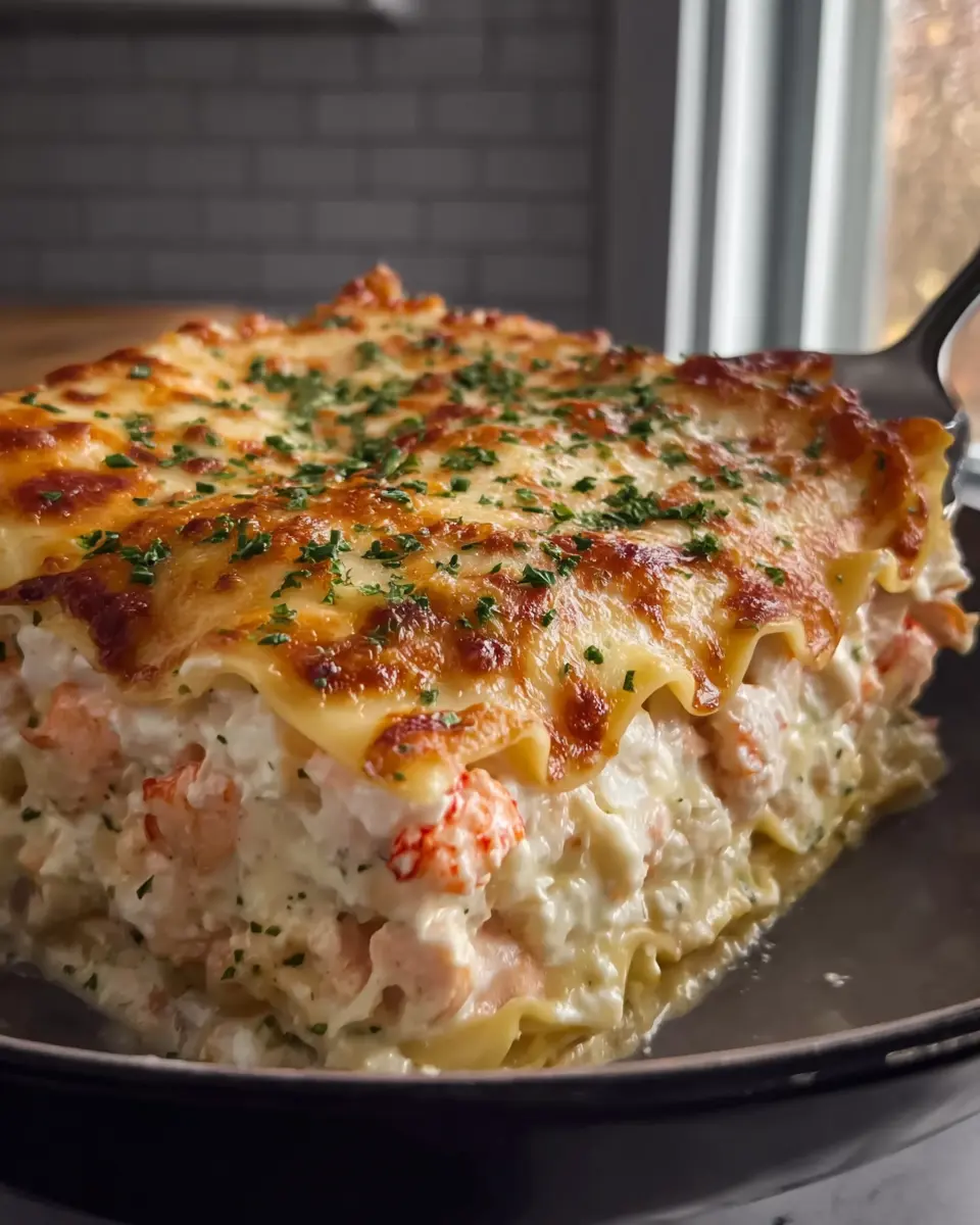 Treat yourself to a delicious Shrimp Alfredo Lasagna stuffed with succulent salmon and crabmeat.