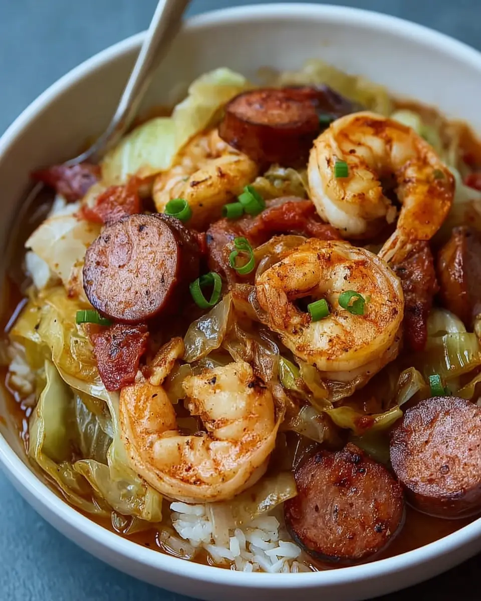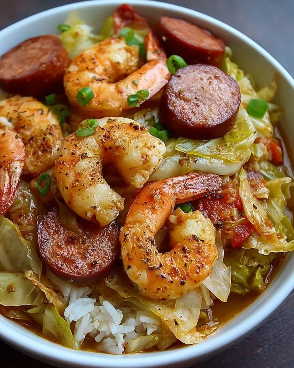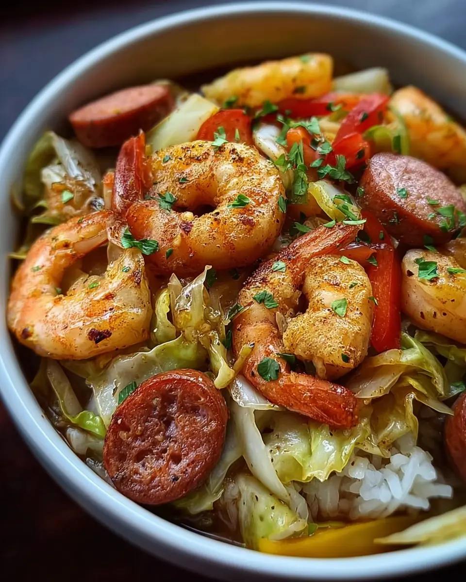 A delicious and nutritious dish featuring shrimp, sausage, and cabbage, perfect for a quick dinner.