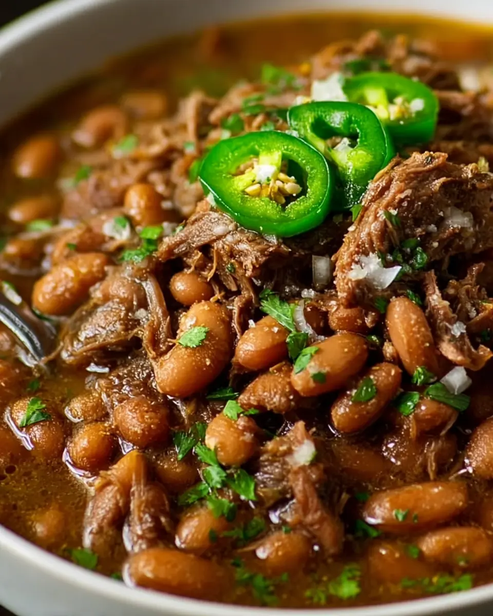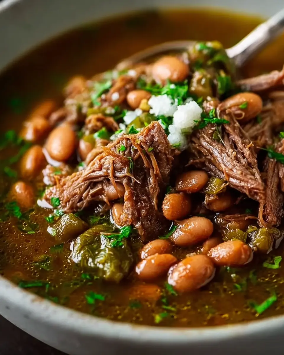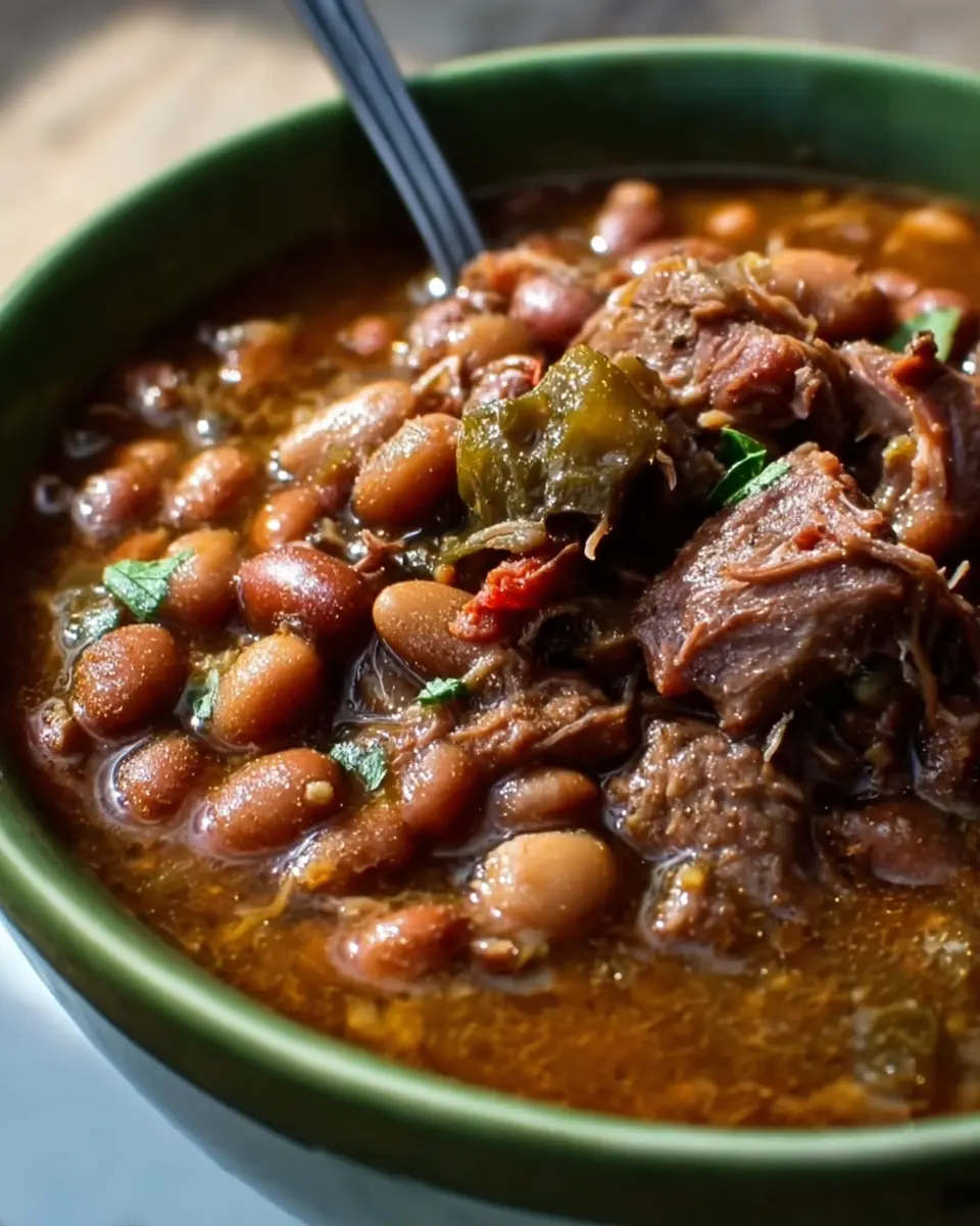 A hearty dish that combines slow-cooked pinto beans, green chiles, and beef for a comforting meal.