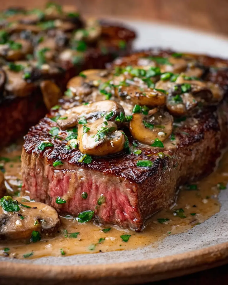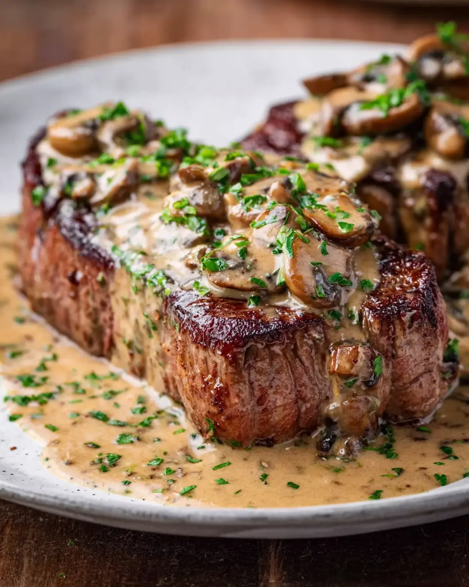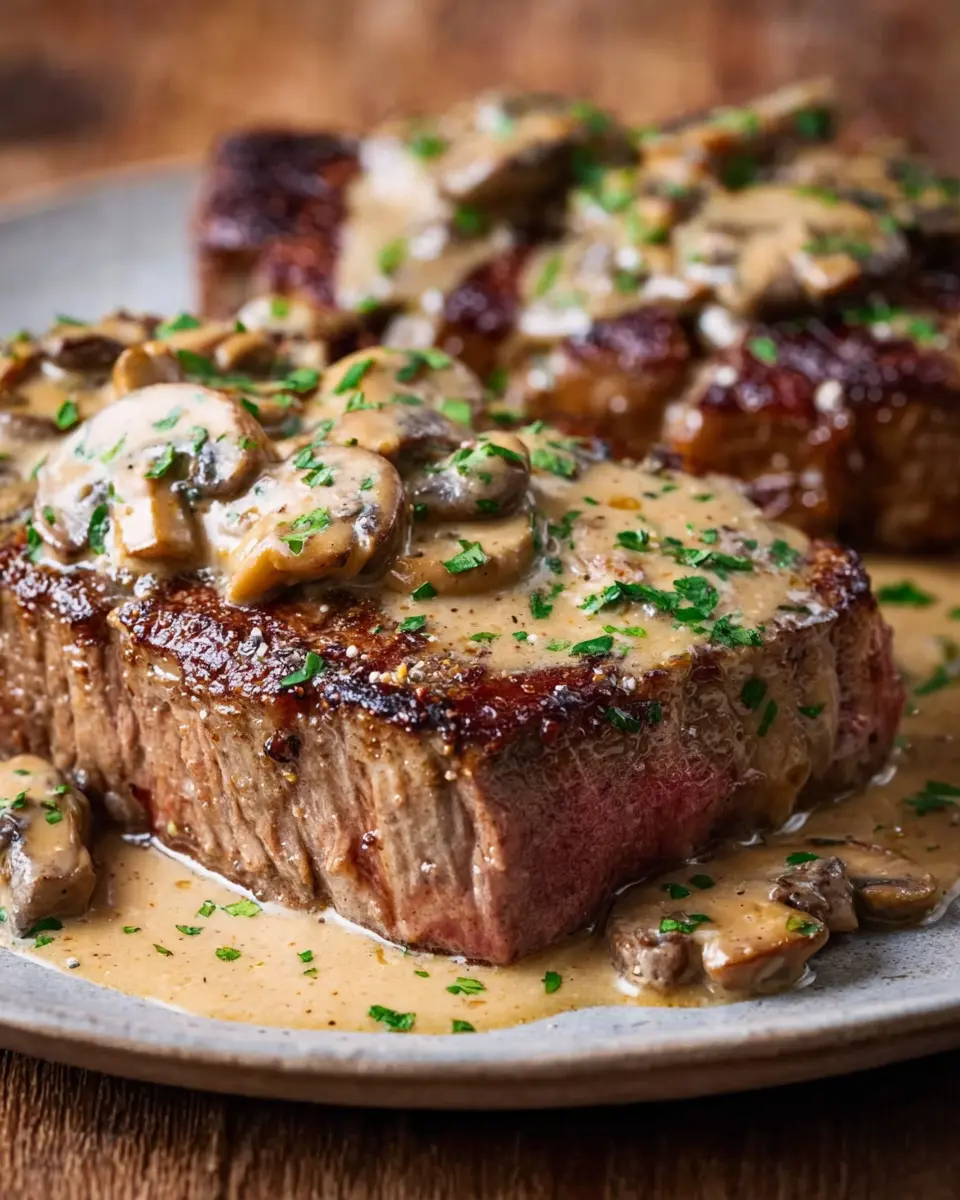 It’s the moment you’ve been waiting for—plating. Place the cooked steak on a plate, and generously spoon the creamy mushroom sauce over the top. For an Instagram-worthy finish, sprinkle some freshly chopped parsley for a pop of color.
