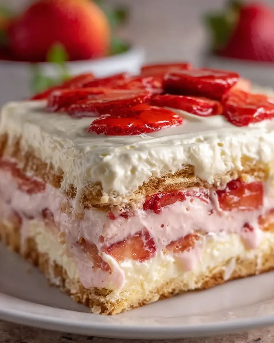 A delicious and indulgent dessert that combines the flavors of fresh strawberries and rich cream in an easy-to-make eclair cake.