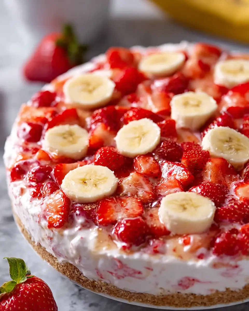 After the base has chilled, it’s time for the grand assembly! In a large mixing bowl, combine the creamy cheesecake mixture with the sliced strawberries and bananas. Gently fold the fruit into the mixture to prevent bruising.