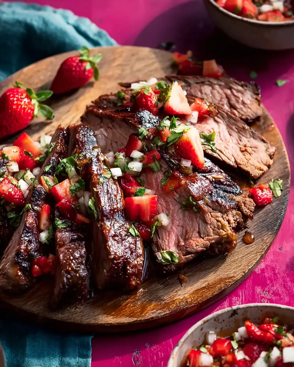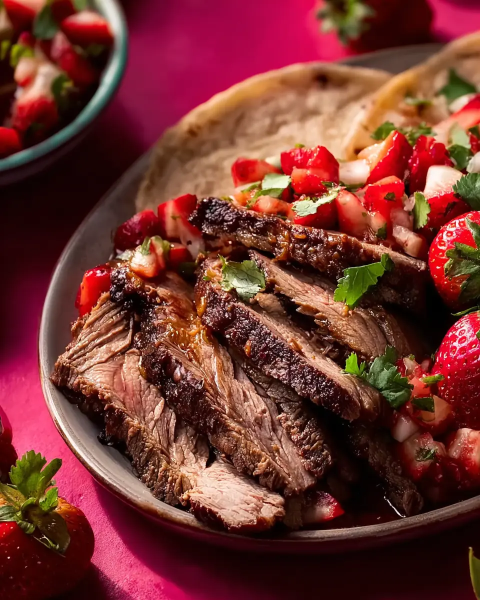 Now, the moment you’ve been waiting for! Slice your grilled strawberry barbecue beef against the grain and serve it with a generous spoonful of fresh strawberry salsa on top. This dish pairs beautifully with sides like grilled vegetables or a simple green salad.