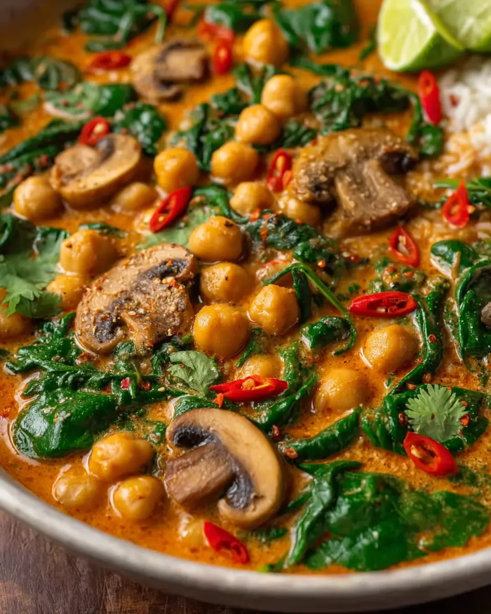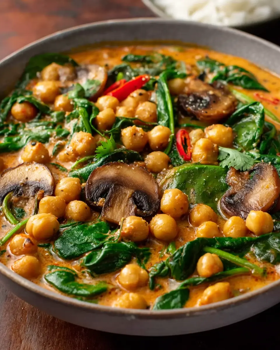 This easy Thai Red Curry Chickpeas recipe combines the rich flavors of curry with mushrooms and spinach for a delightful meal.