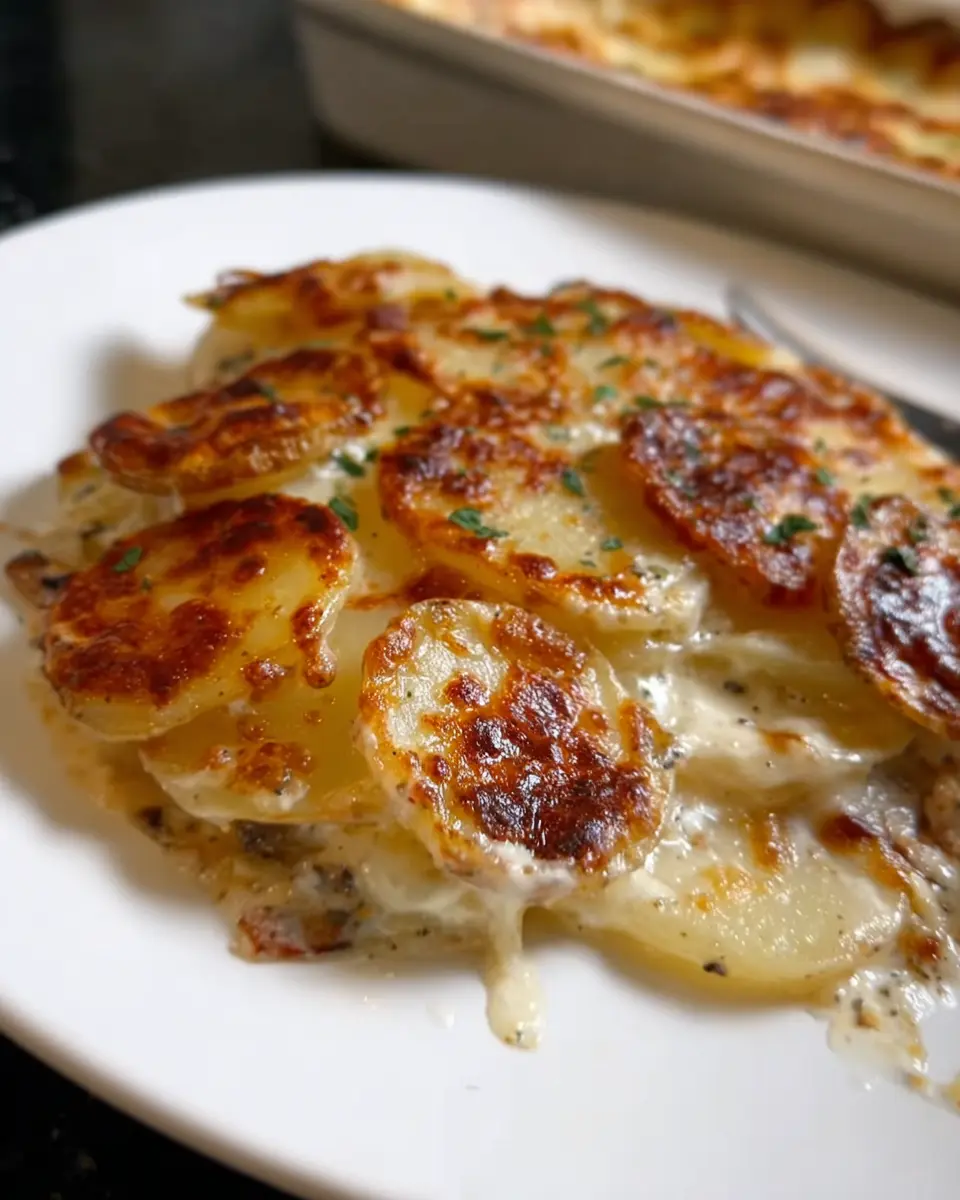 The Absolute Best Coziest Scalloped Potatoes are creamy, cheesy, and loaded with turkey bacon, making them a perfect comfort food.
