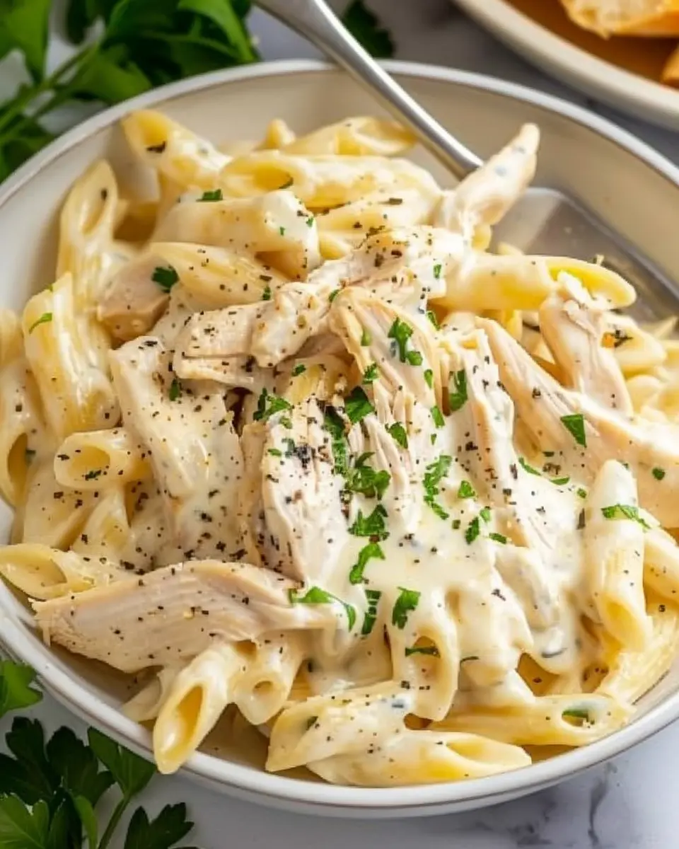 The BEST Crockpot Chicken Alfredo is a creamy, comforting dish that combines tender chicken with rich Alfredo sauce and crispy turkey bacon. Perfect for weeknight dinners!